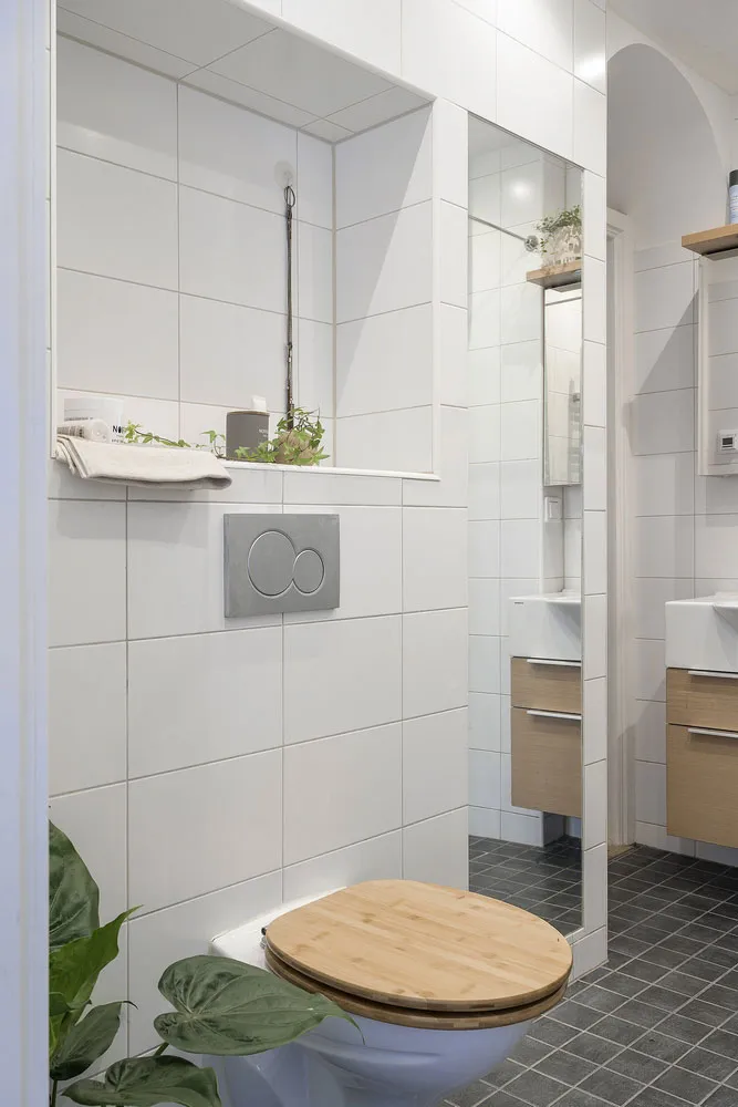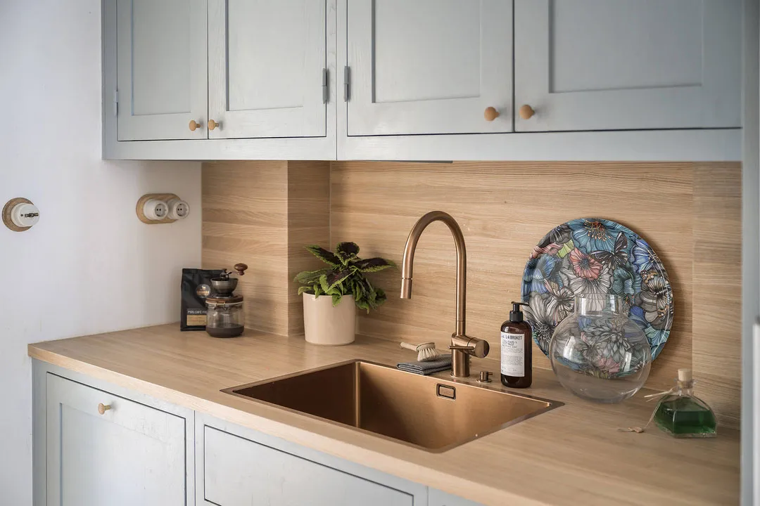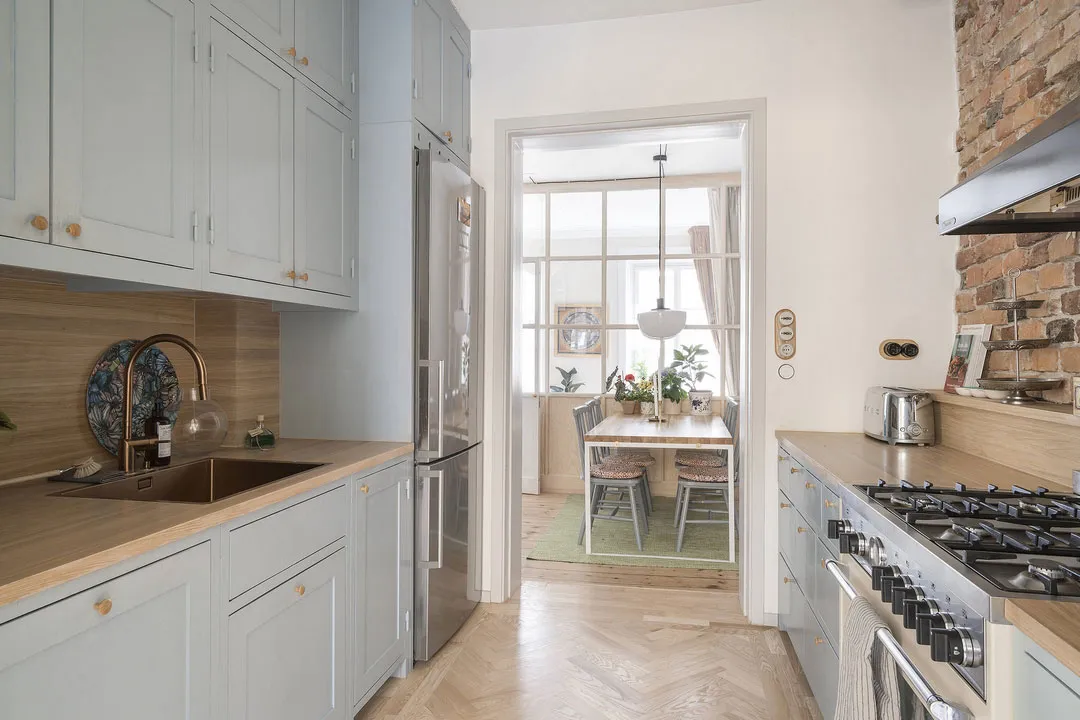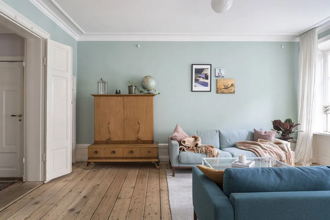 The combination of vintage wood and blue walls became the main design idea for this apartment in Stockholm.