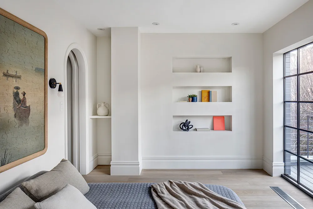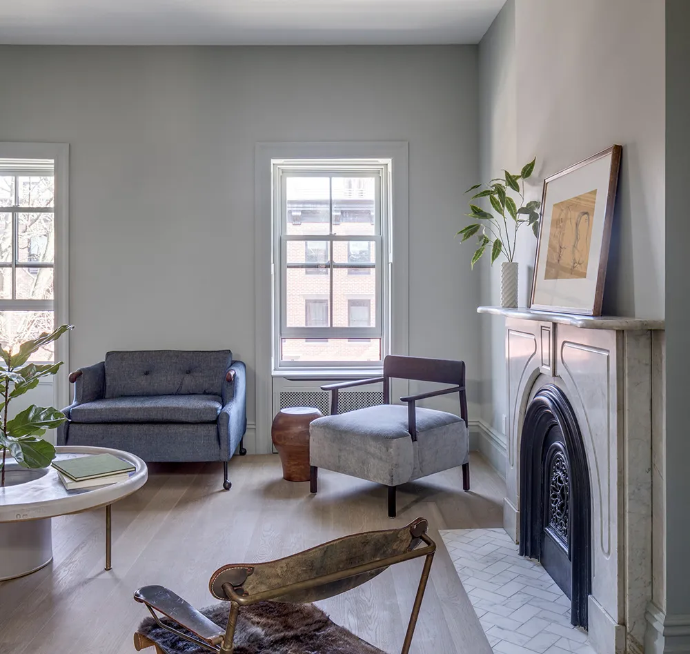 In this Brooklyn townhouse, there is very little color—walls are mostly white, and the furniture is chosen in a minimalist style with almost no bright accents.