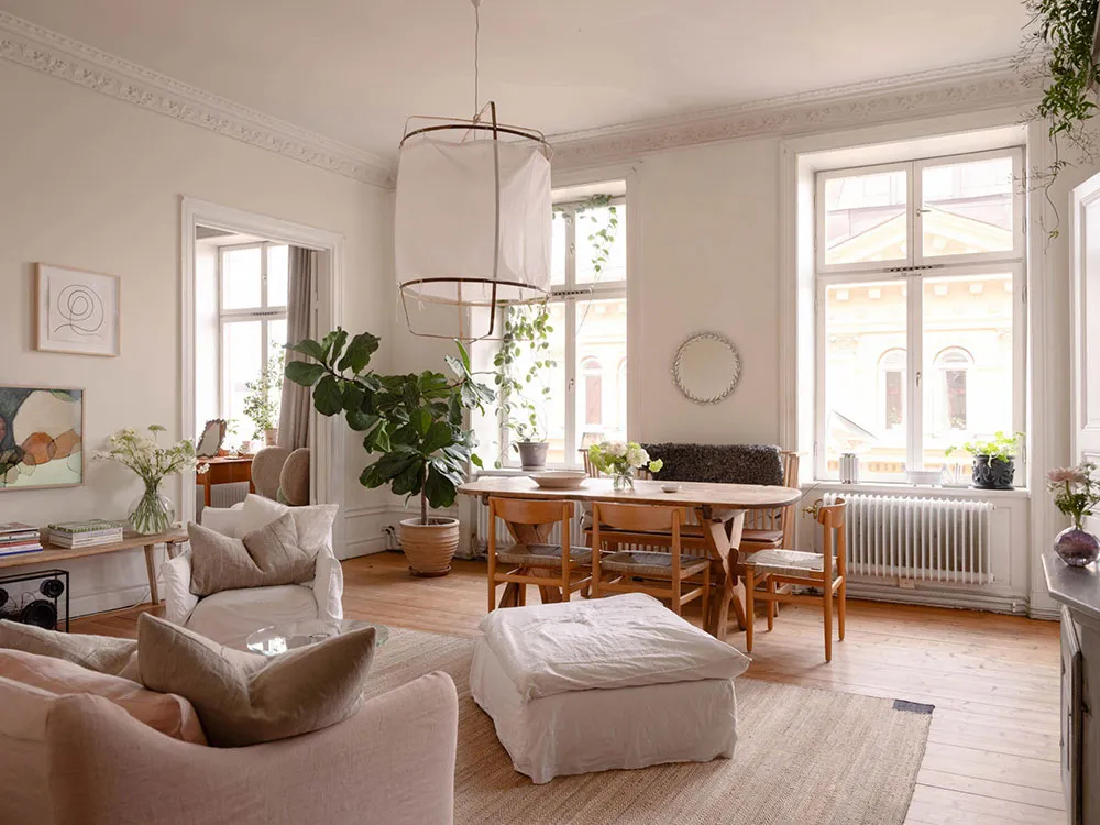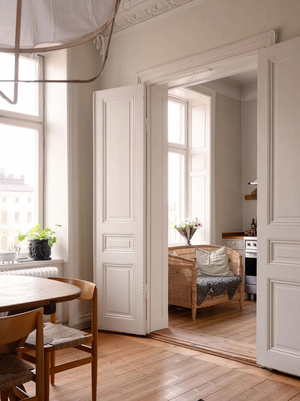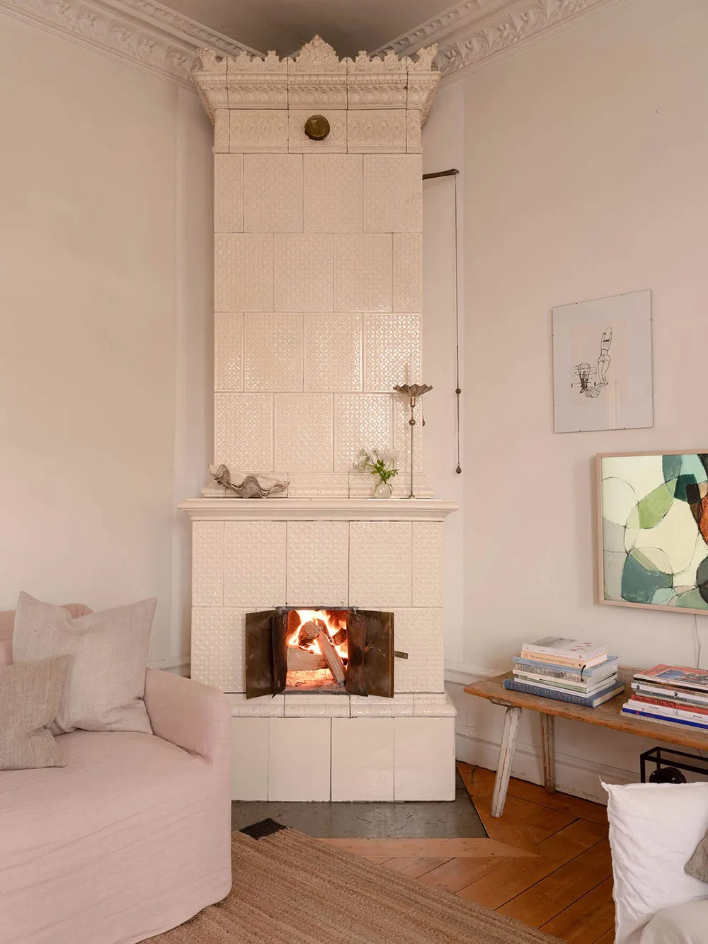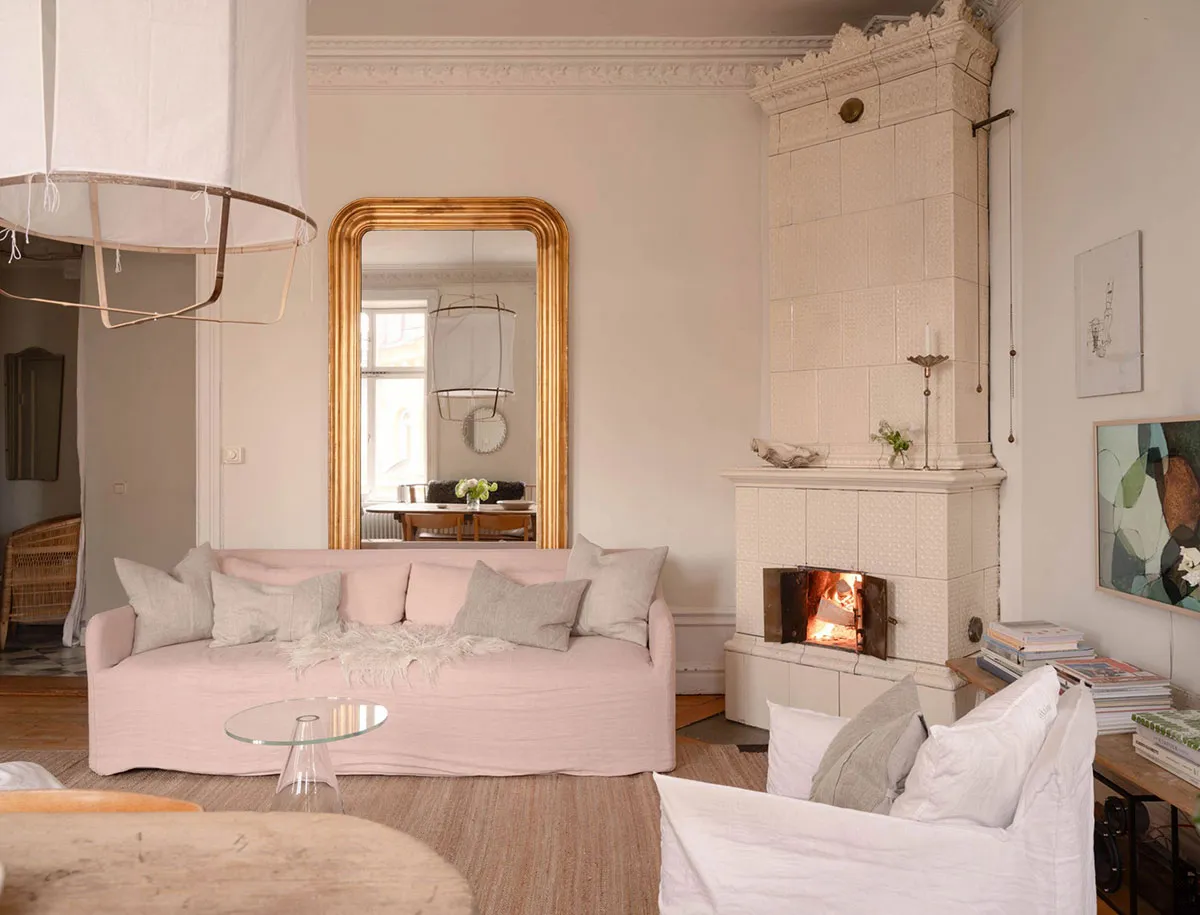 This apartment in an old Stockholm house is a pleasant mix of vintage details, Scandinavian decor, and soft pastel accents.