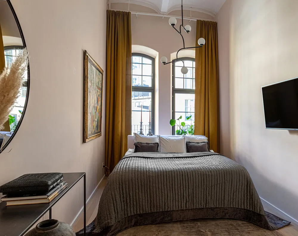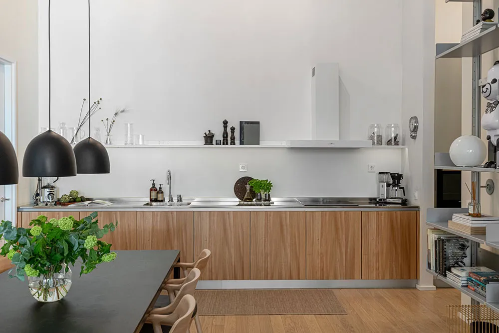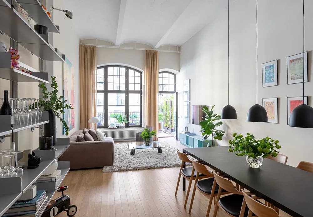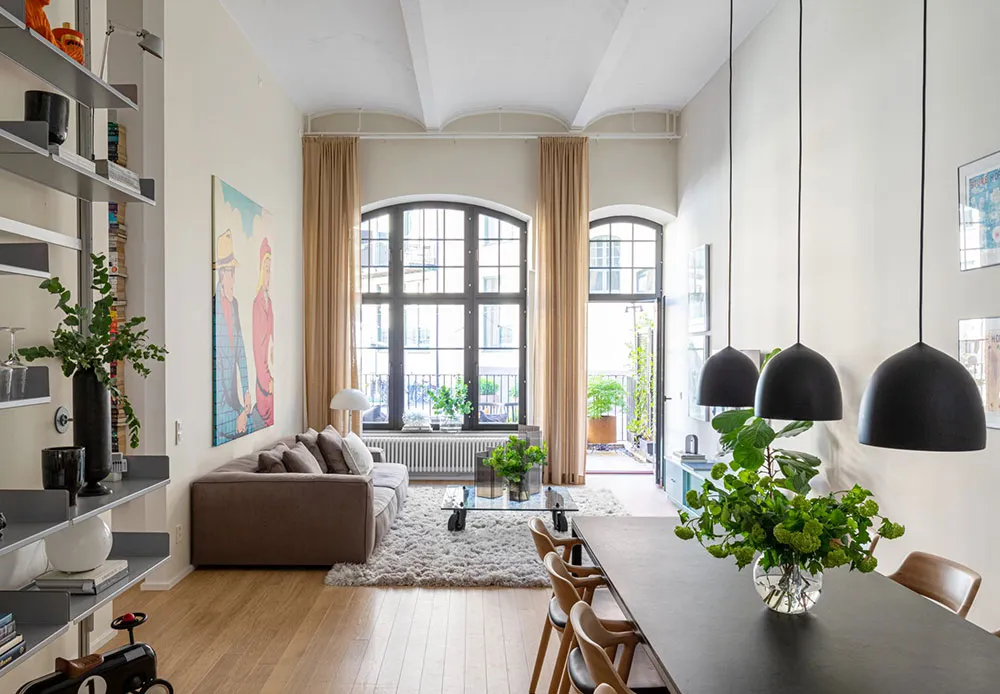The coved ceilings in the interior of this apartment in Stockholm immediately give a hint — the living space is located in a former industrial building.