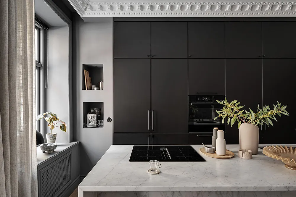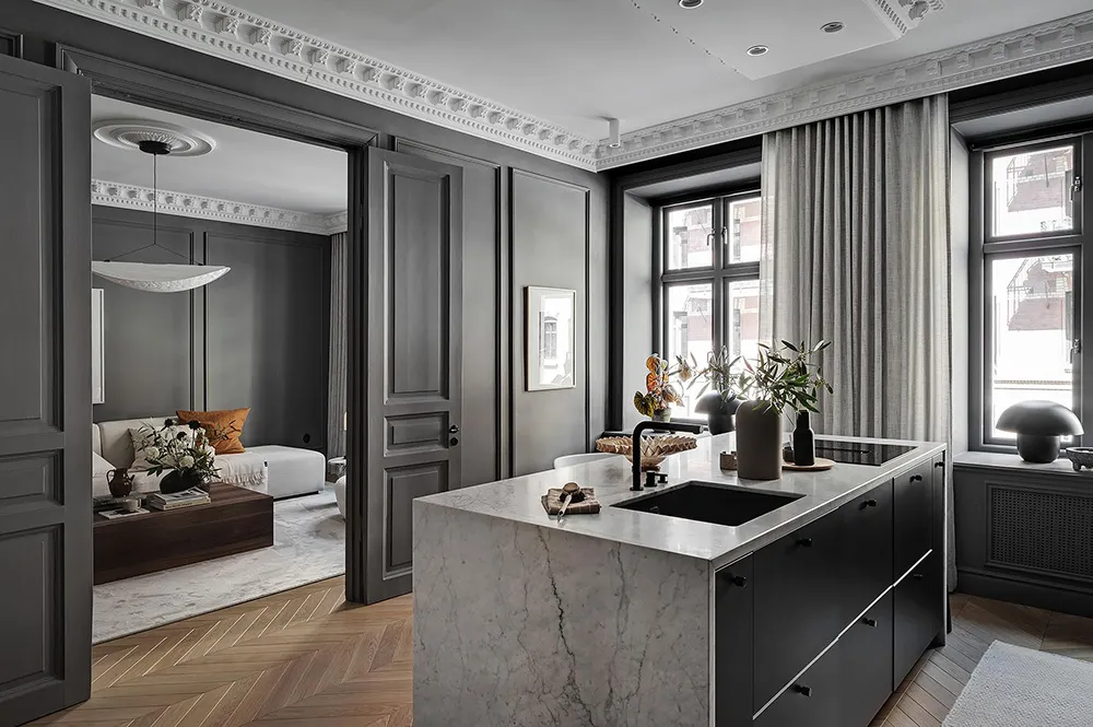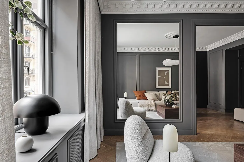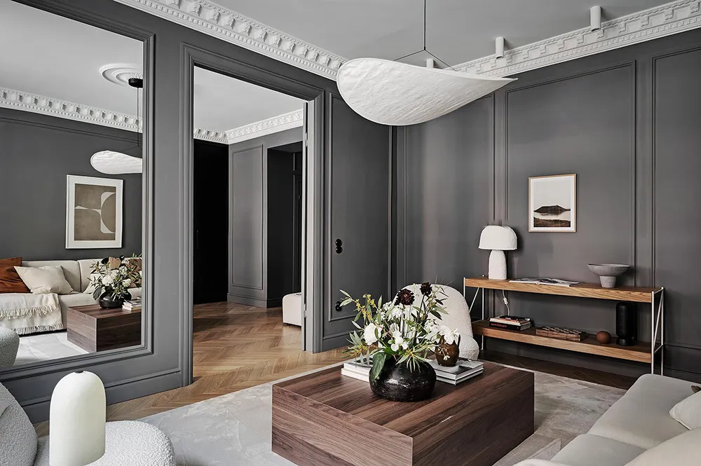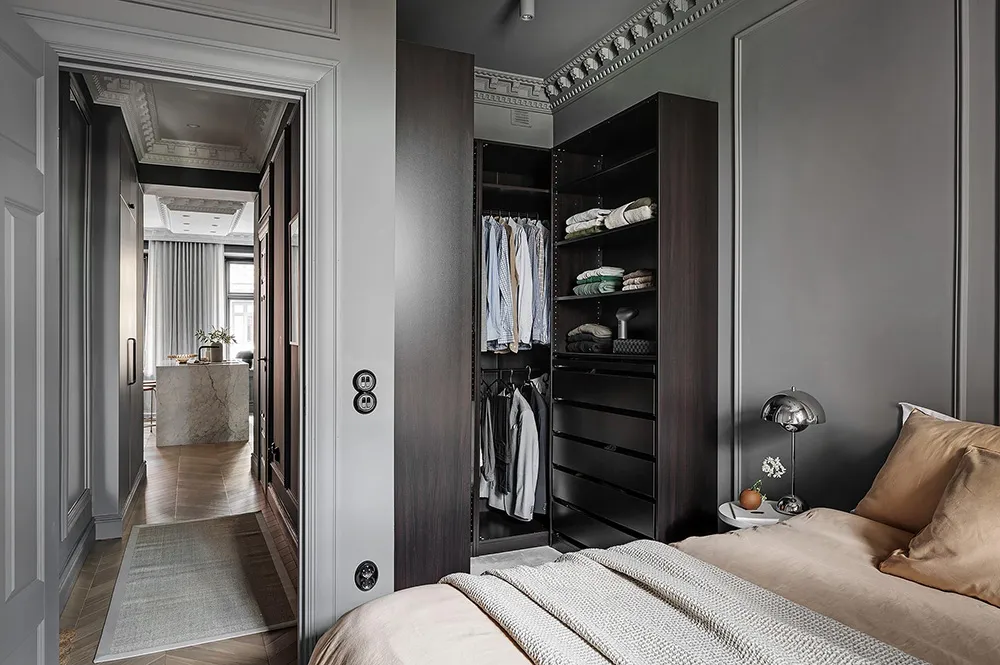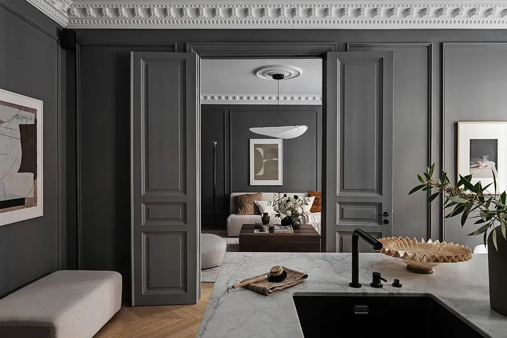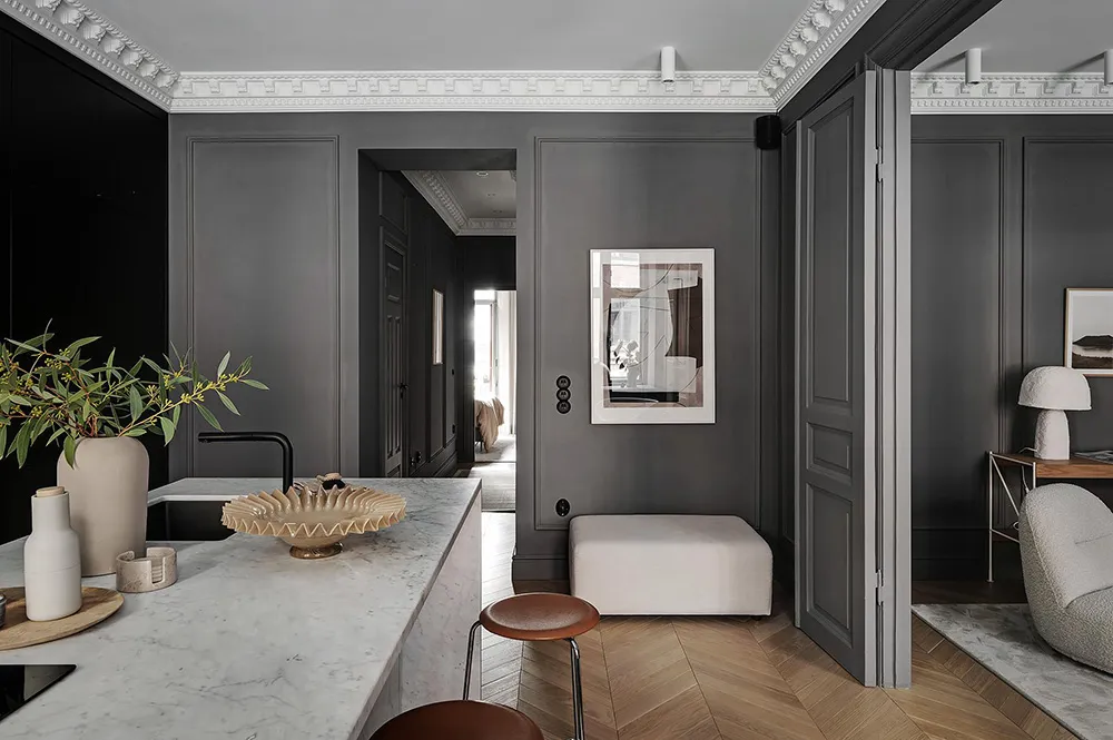 Dark gray graphite walls and light furniture create an impressive interior in this small two-bedroom apartment in Sweden, featuring bold and stylish color contrasts.