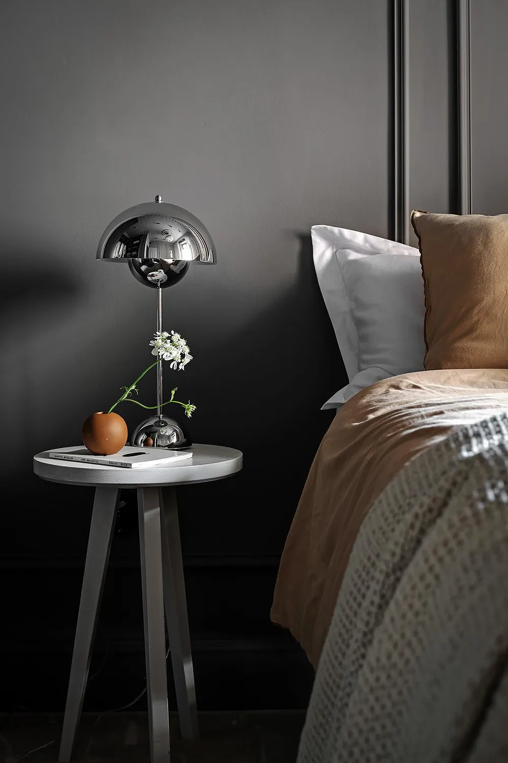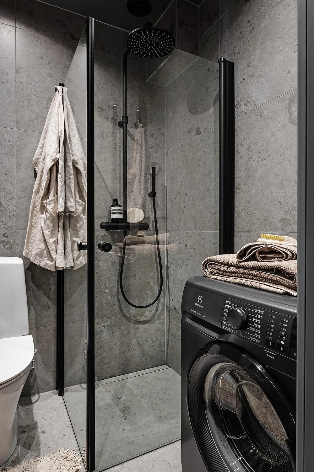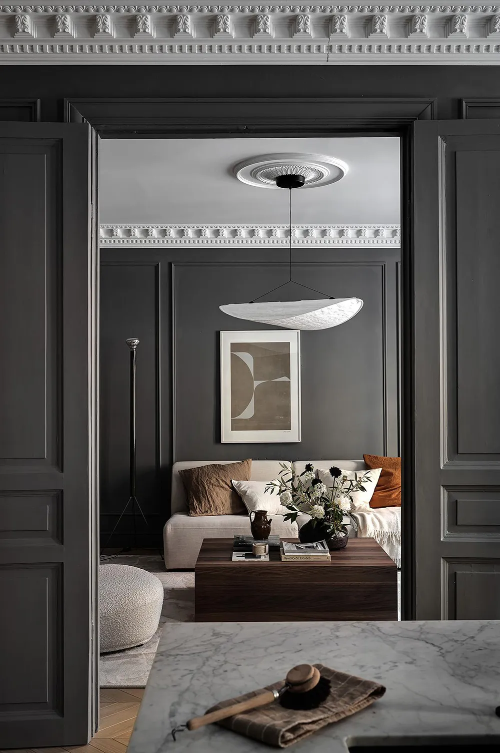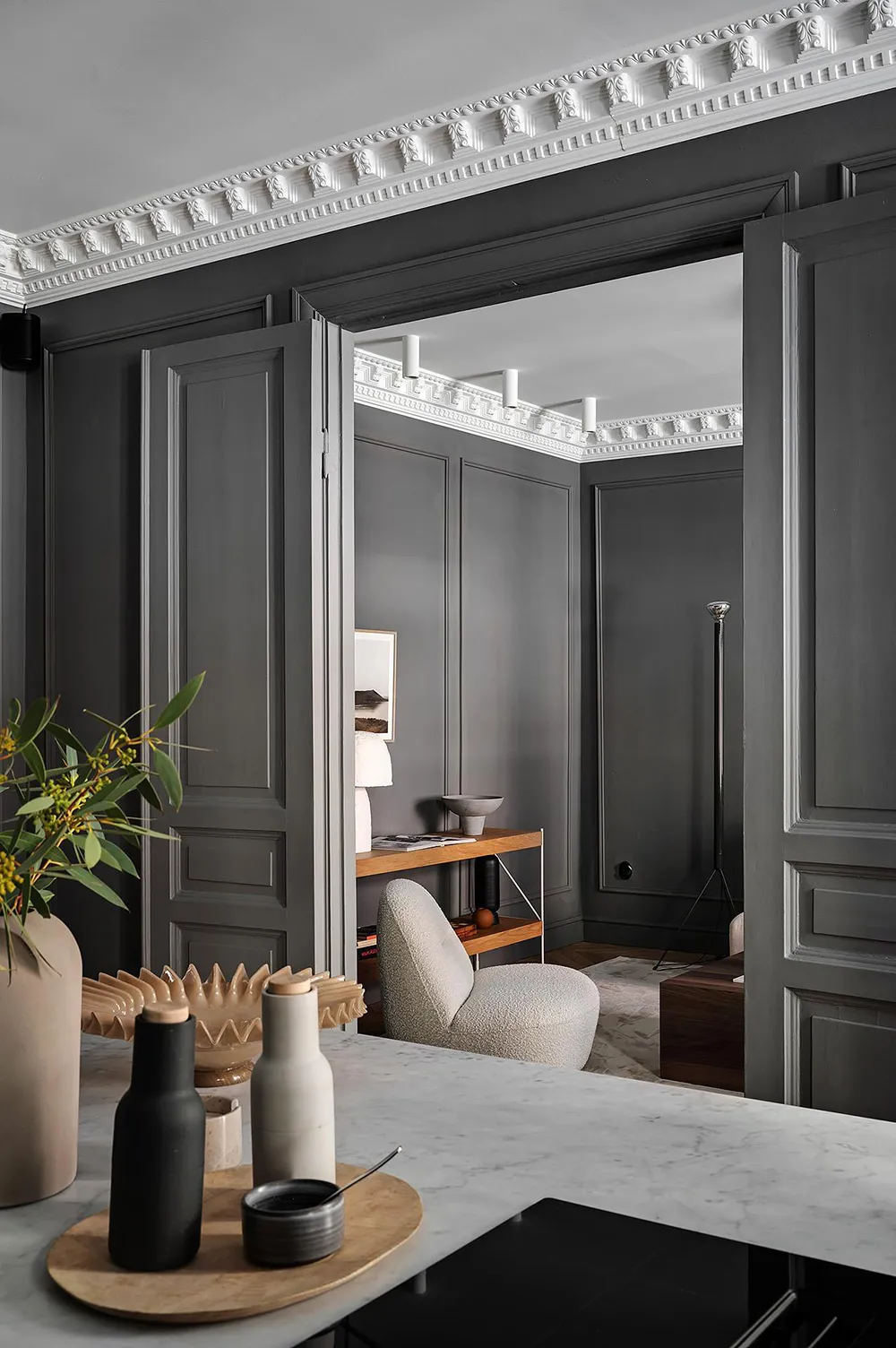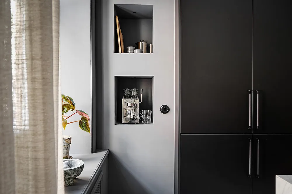 Dark gray graphite walls and light furniture create an impressive interior in this small two-bedroom apartment in Sweden, featuring bold and stylish color contrasts.