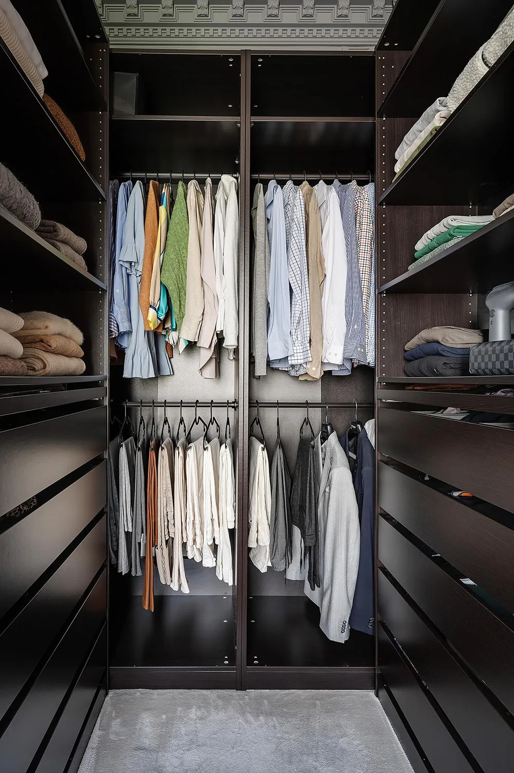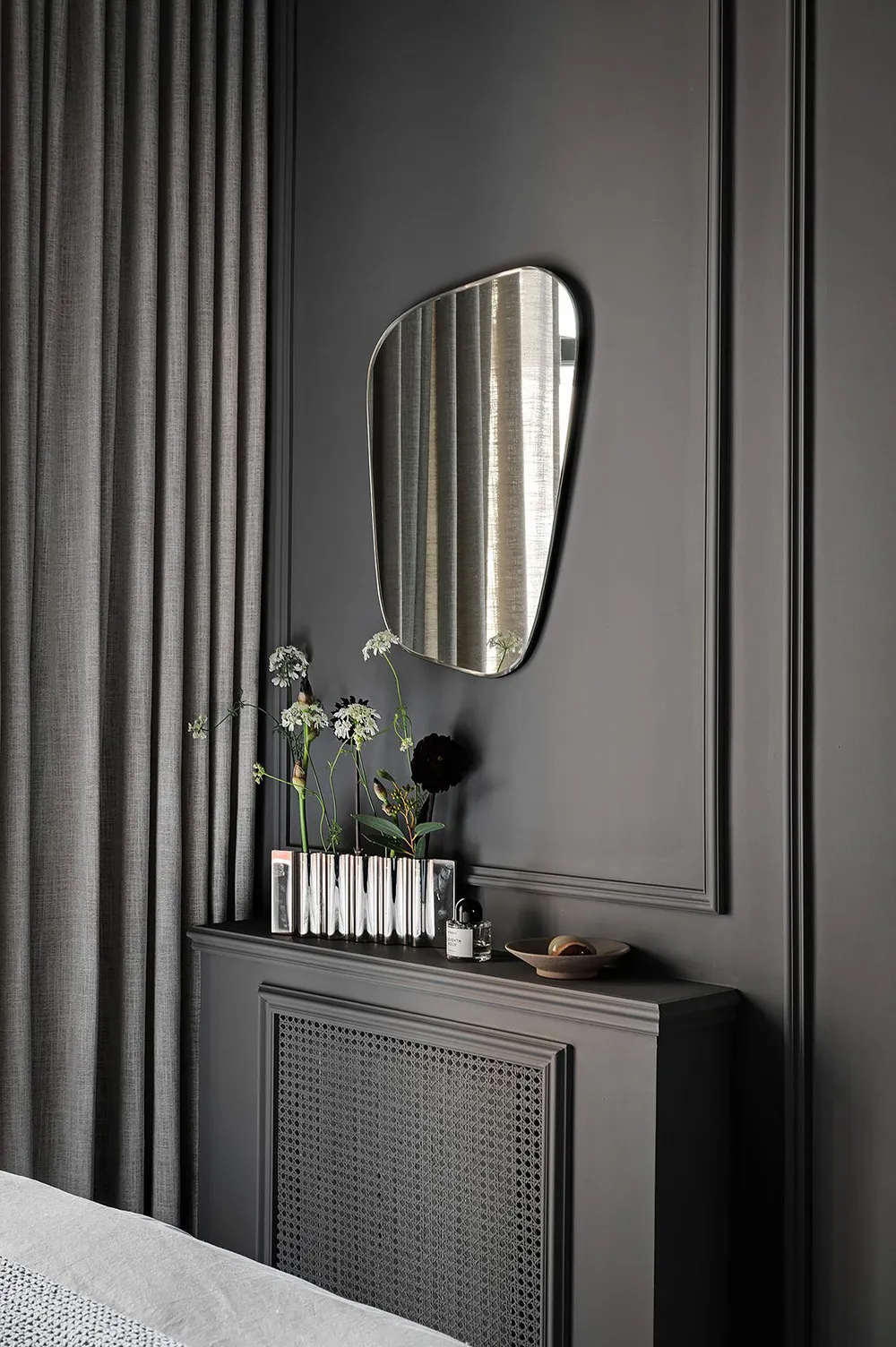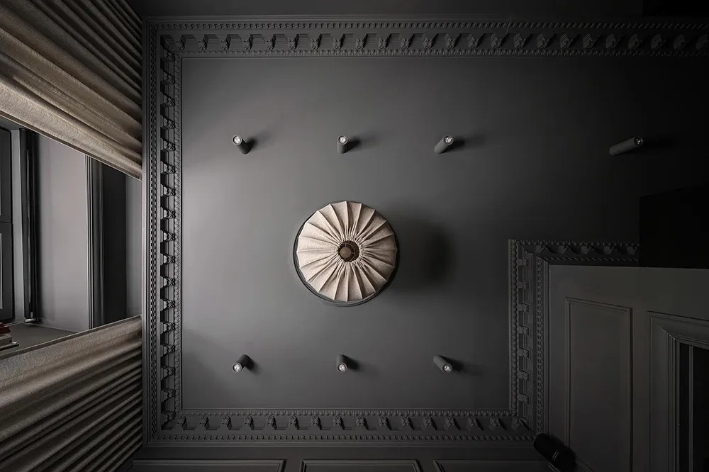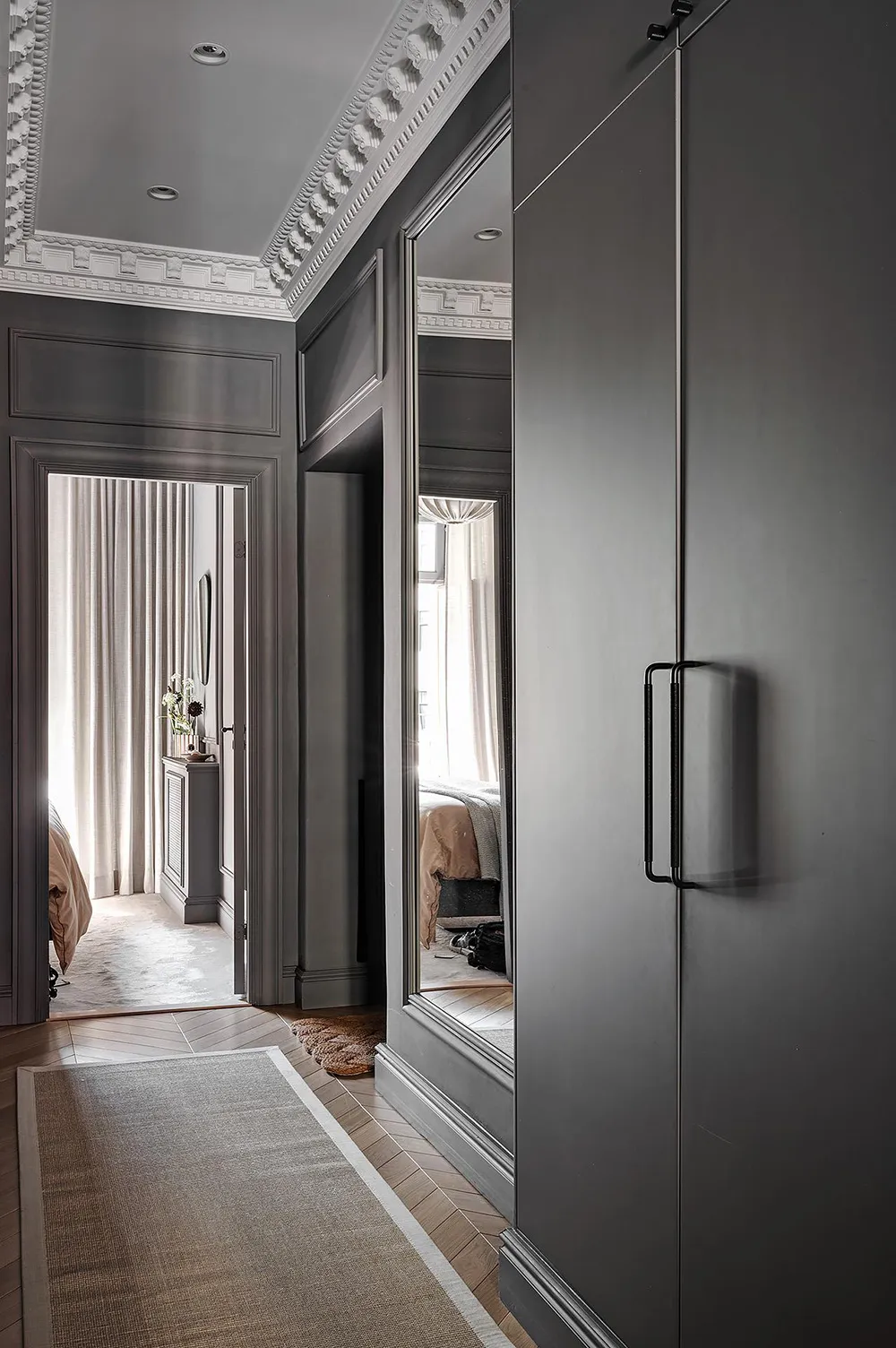 Dark gray graphite walls and light furniture create an impressive interior in this small two-bedroom apartment in Sweden, featuring bold and stylish color contrasts.
