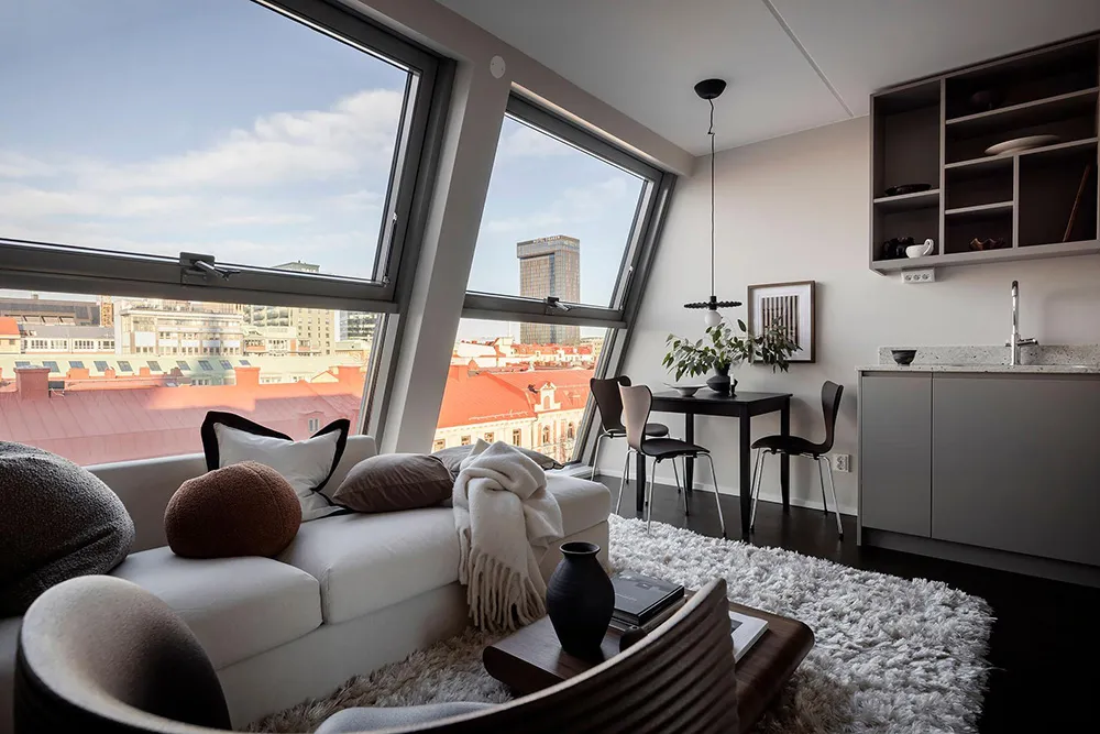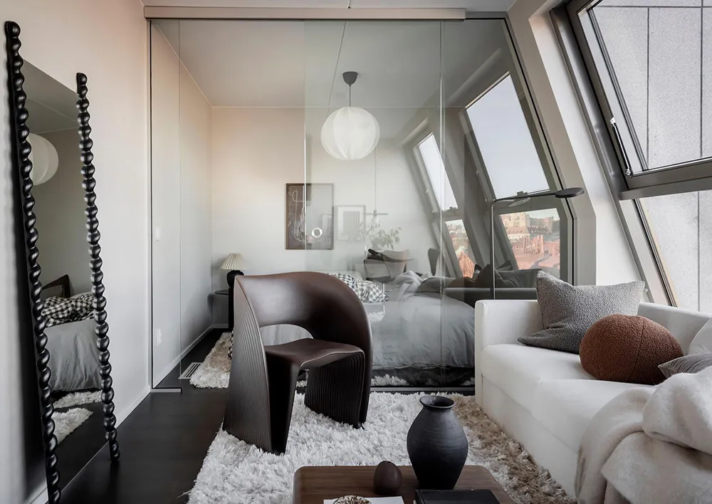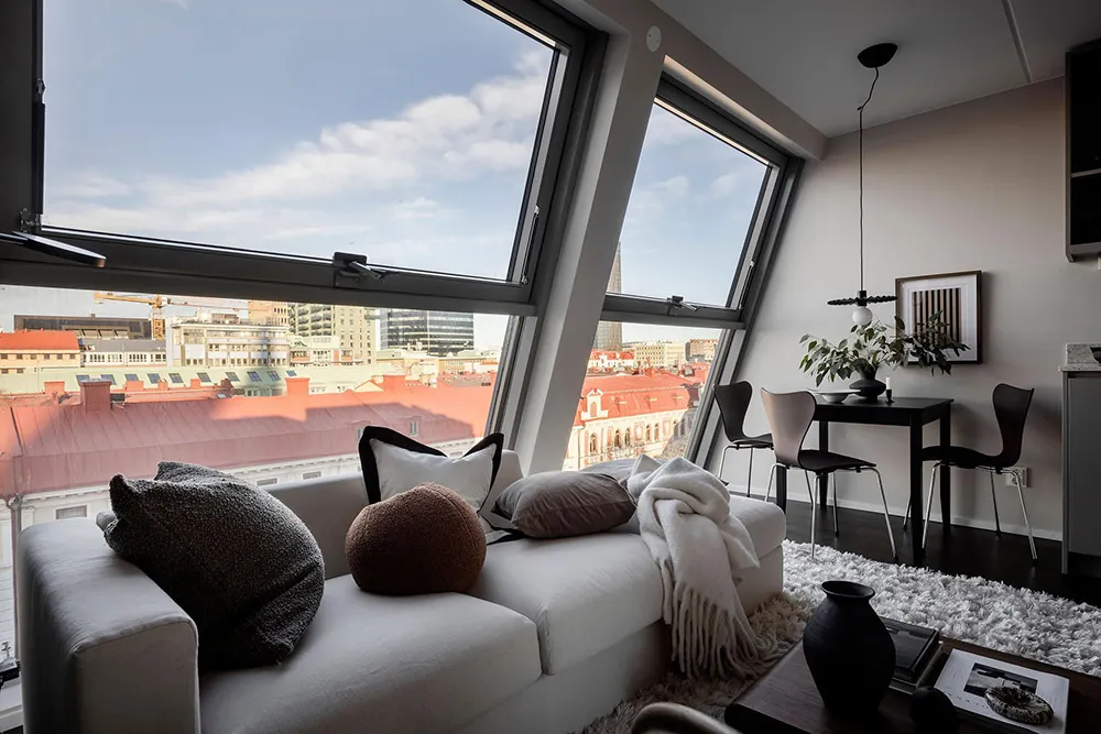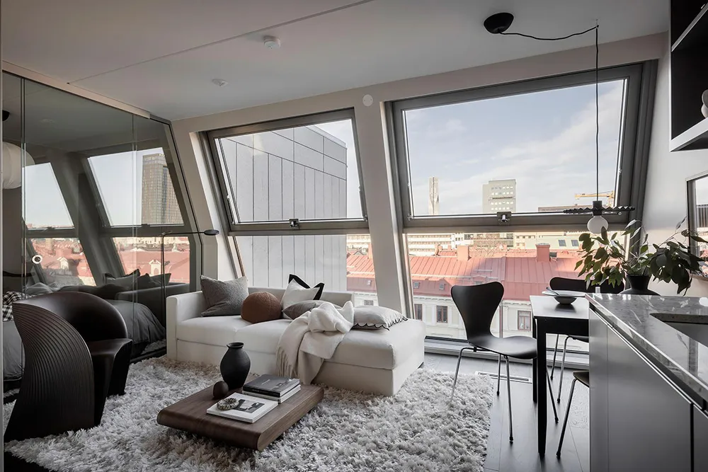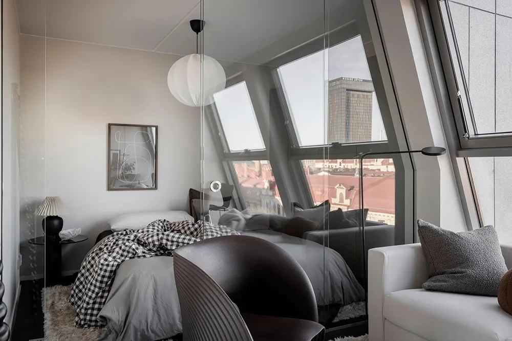 There are not many residential glass skyscrapers in Sweden's major cities (you can count them on the fingers of one hand), so interiors with glass walls are not the most common option in these parts.