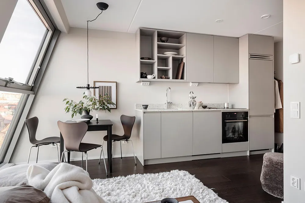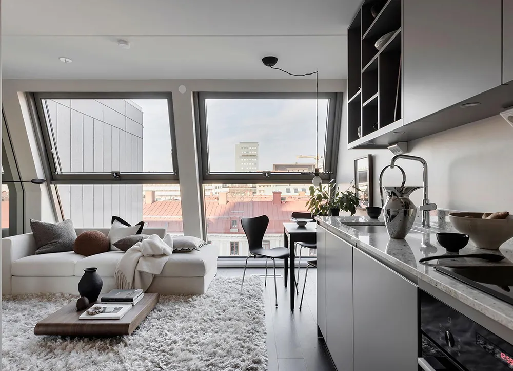 Scandinavian Apartment with Interesting Kitchen, Moldings, and Attic Bedroom
