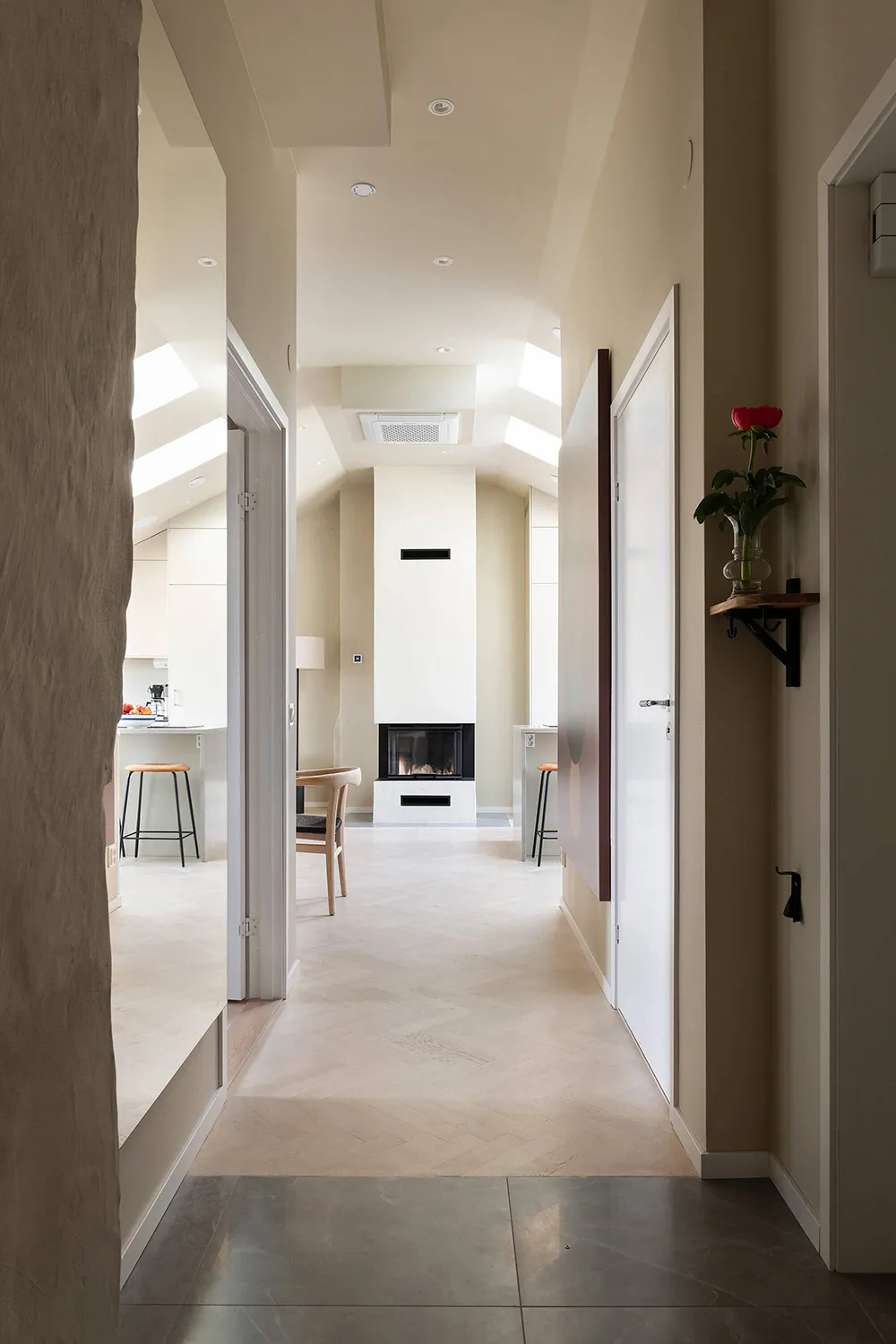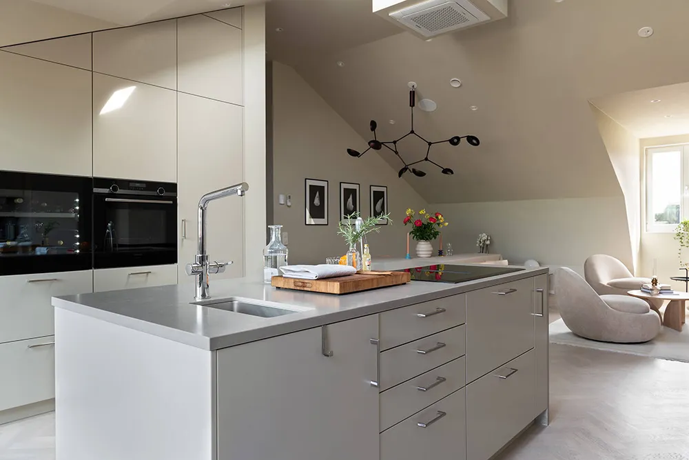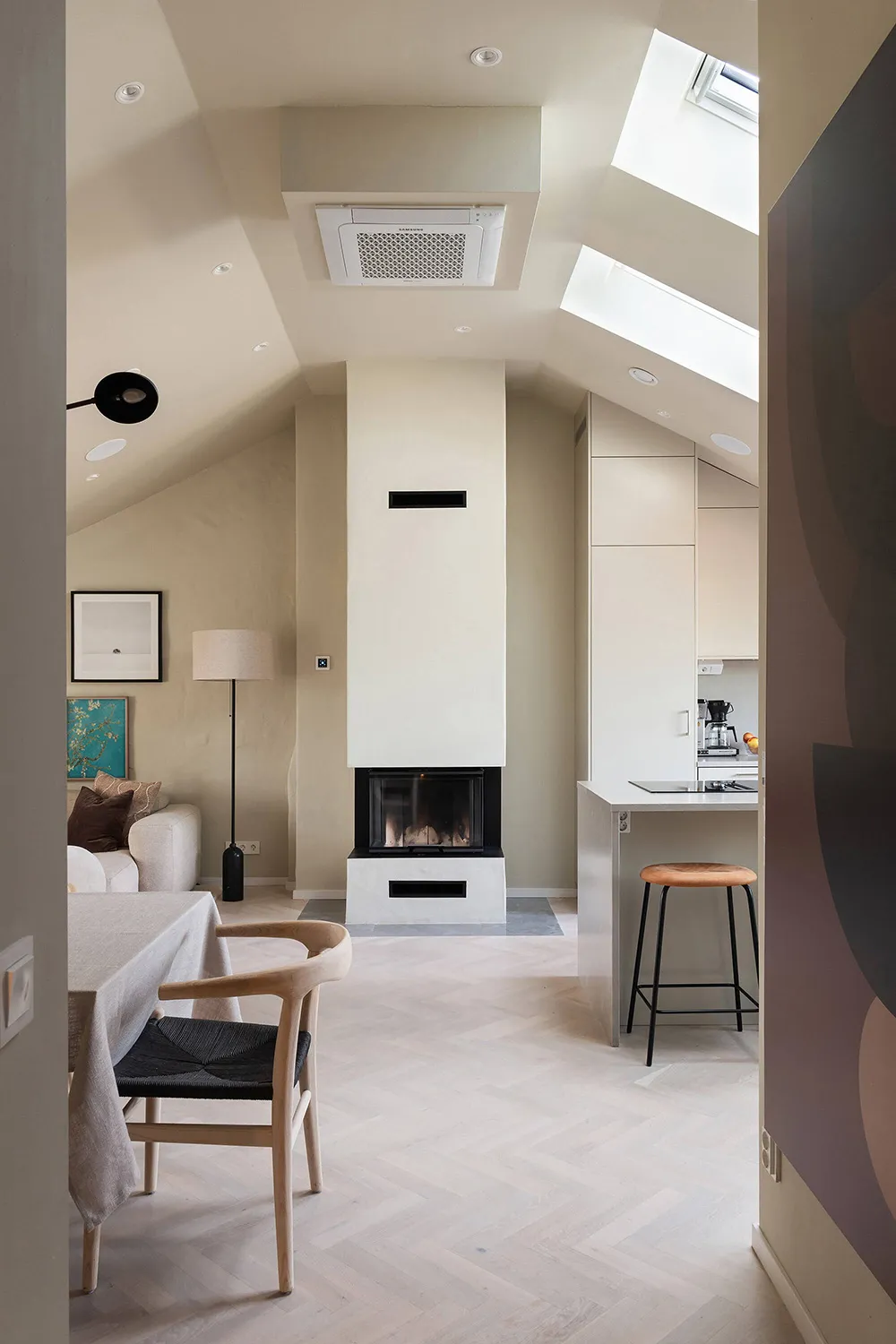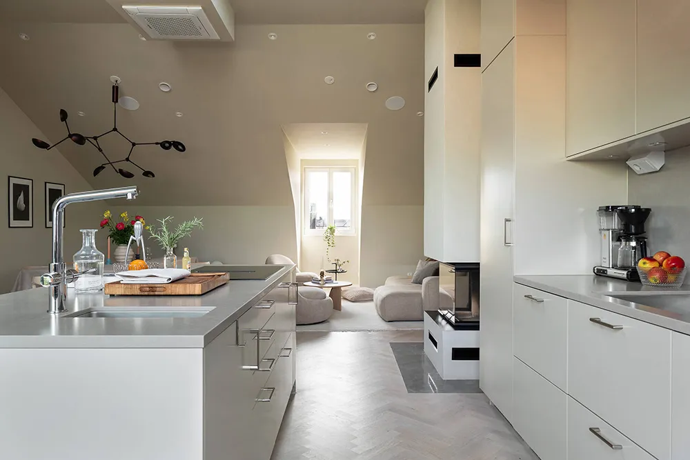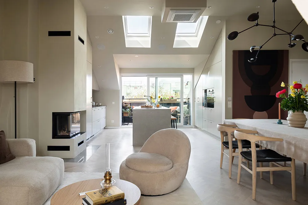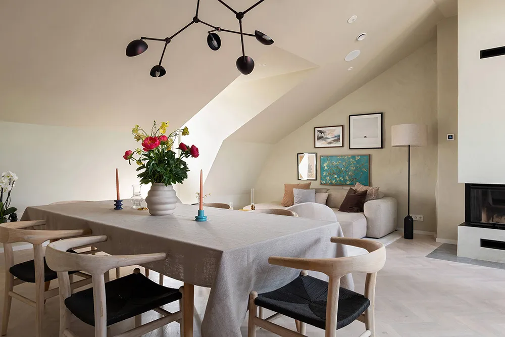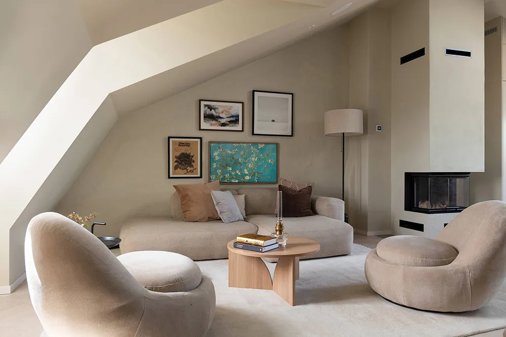 The walls and ceiling of this spacious mansard apartment in Sweden share the same sandy hue — designers chose this approach for tranquility and softness of a monochromatic palette.