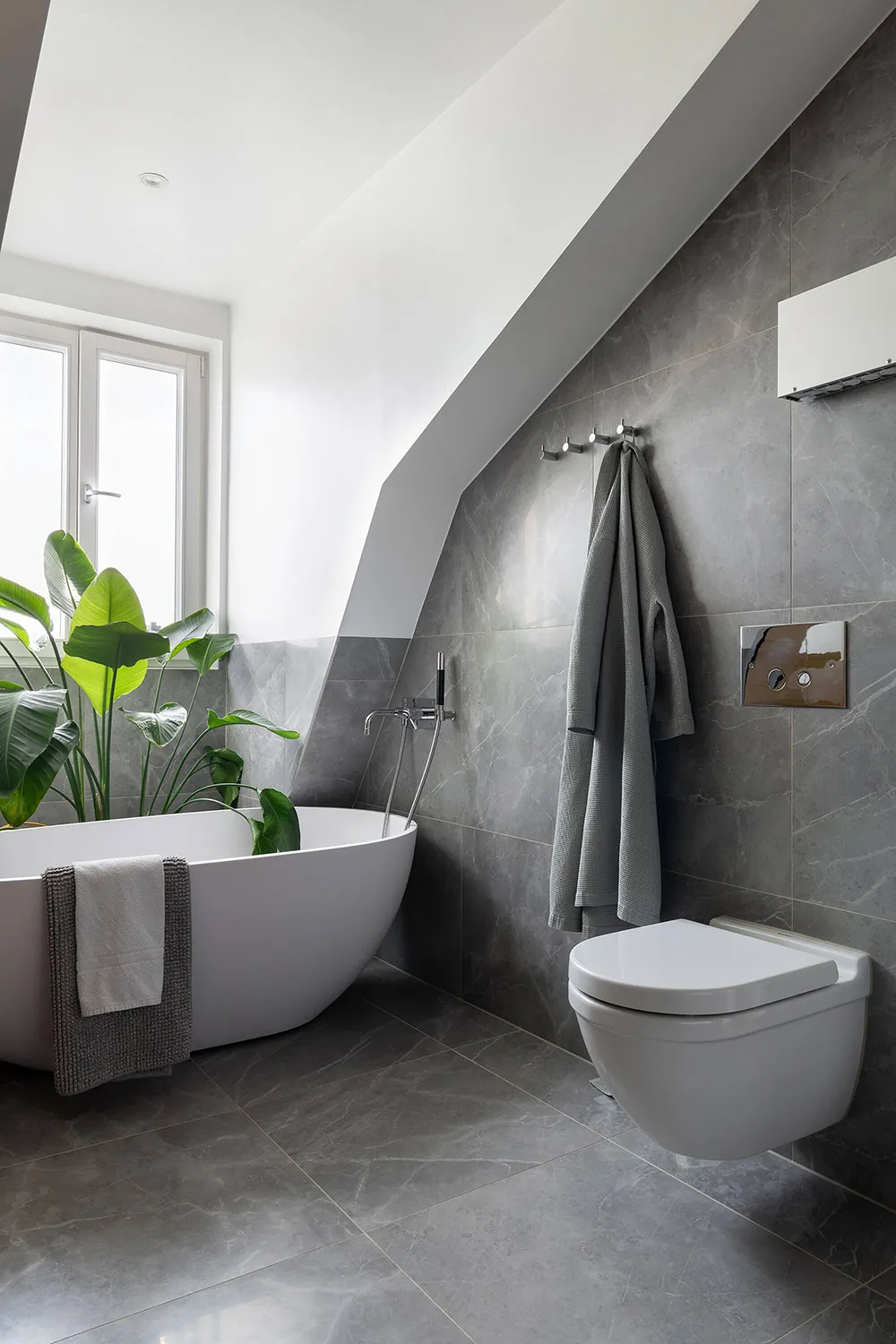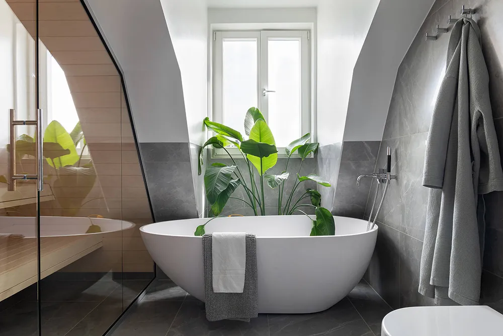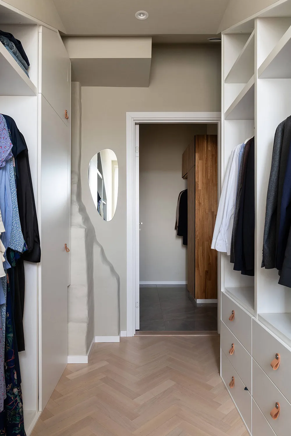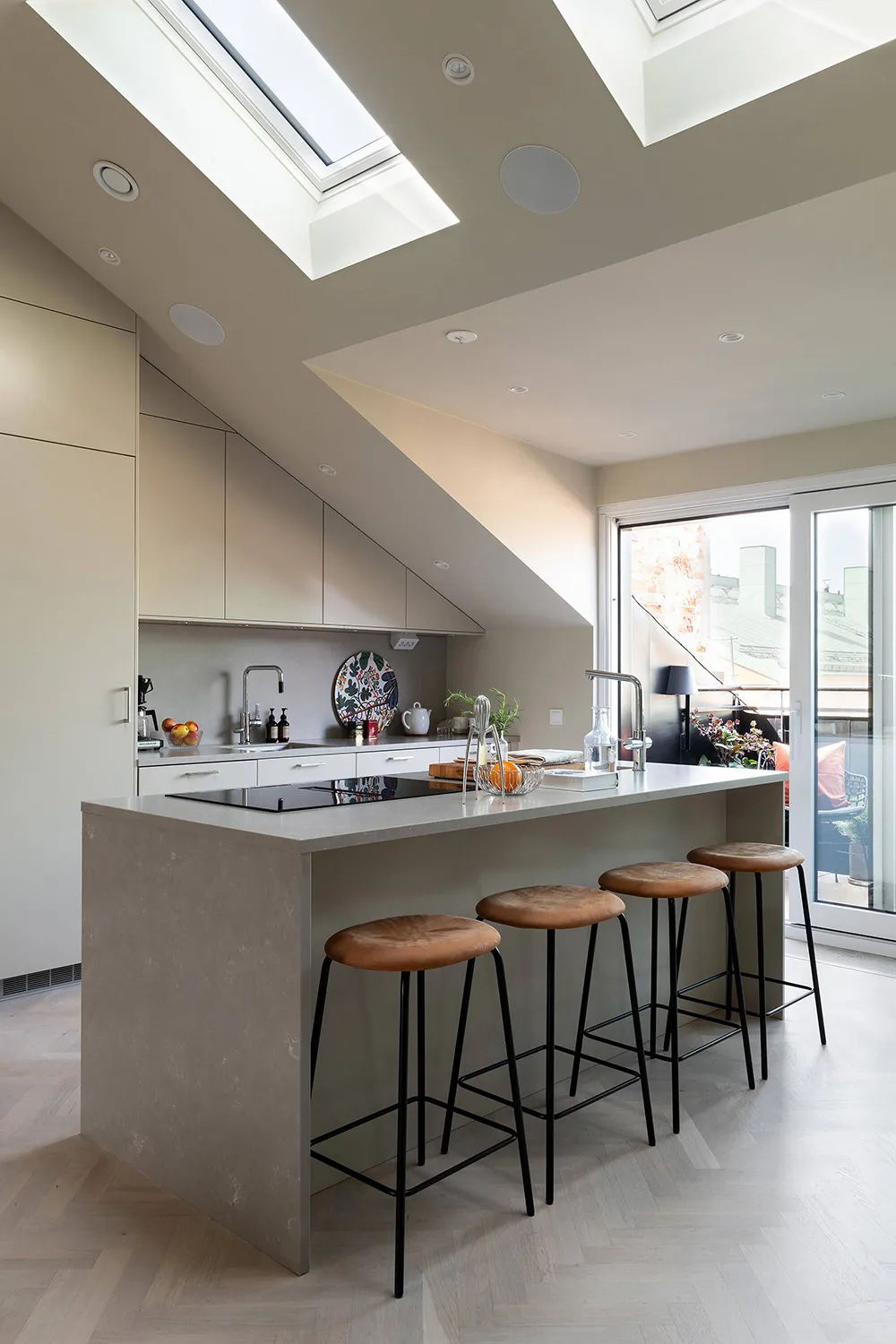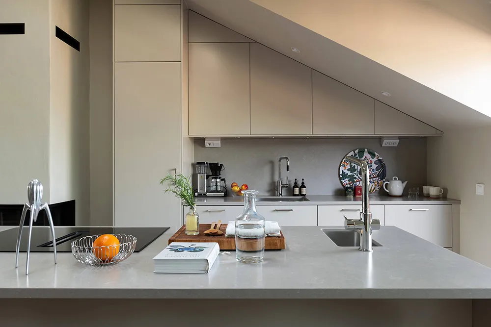 The walls and ceiling of this spacious mansard apartment in Sweden share the same sandy hue — designers chose this approach for tranquility and softness of a monochromatic palette.