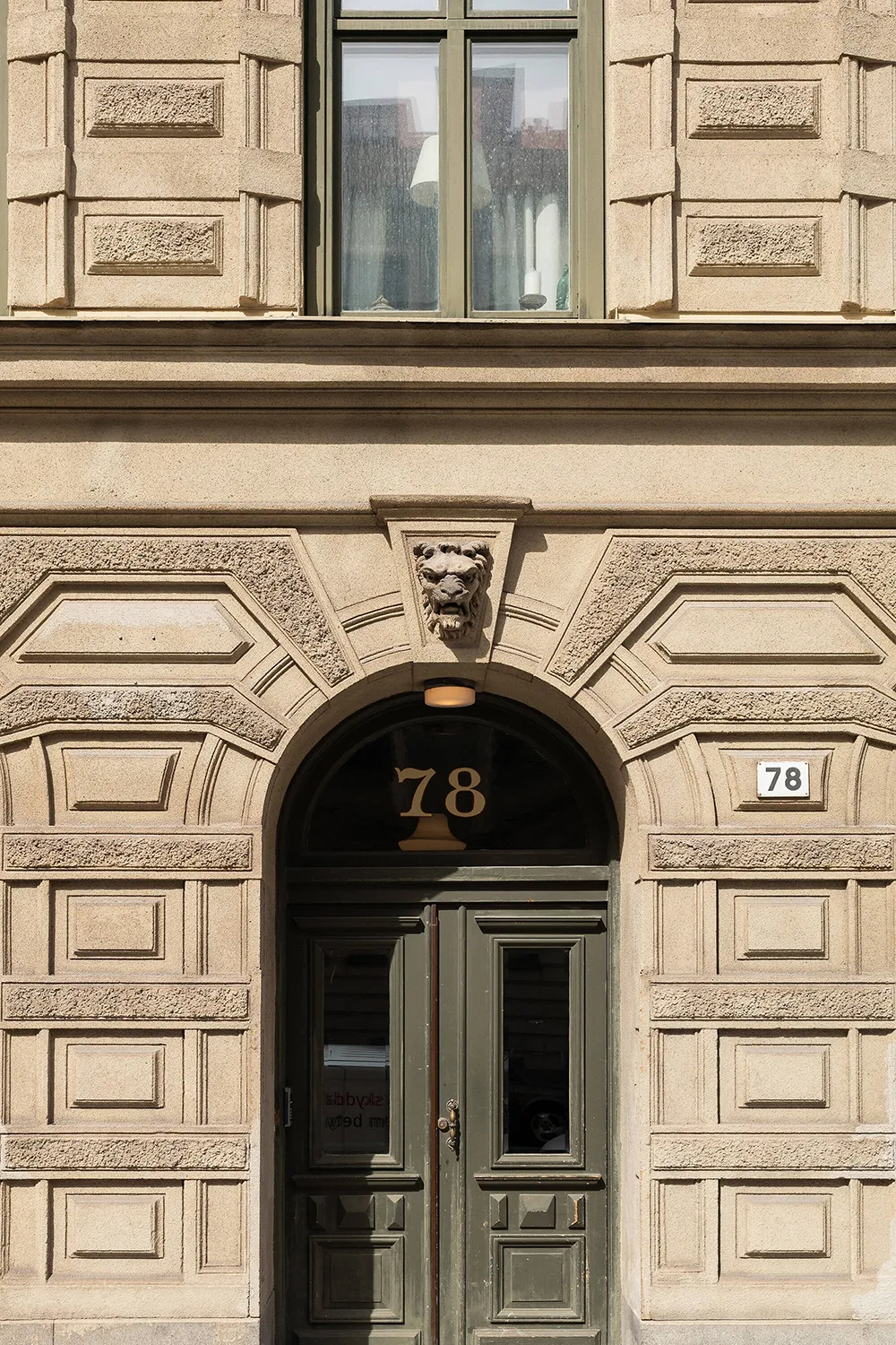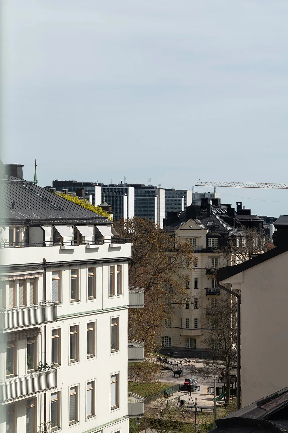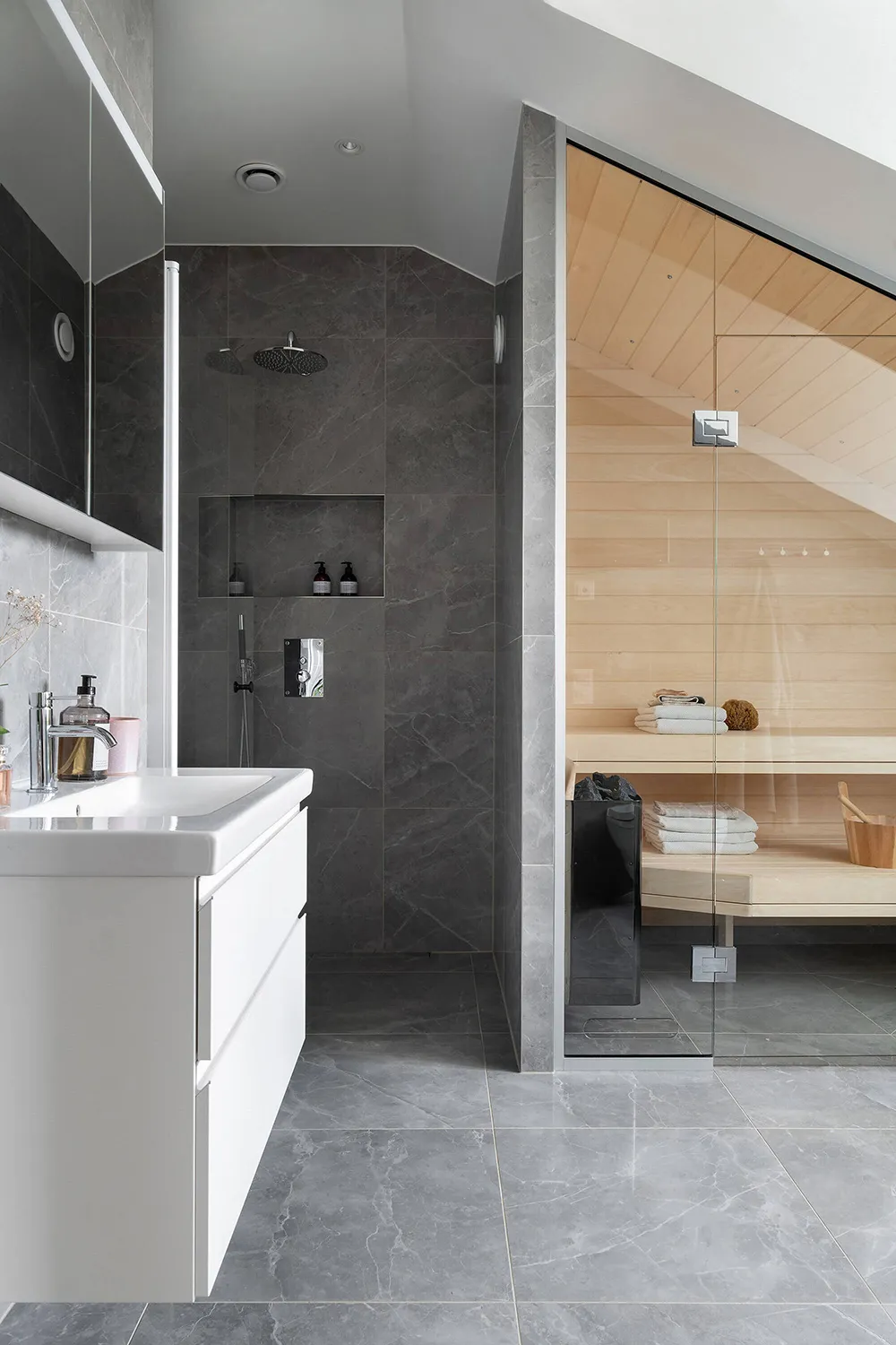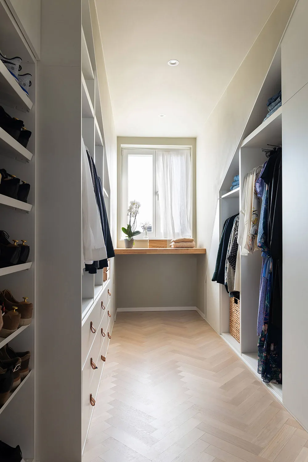 The walls and ceiling of this spacious mansard apartment in Sweden share the same sandy hue — designers chose this approach for tranquility and softness of a monochromatic palette.