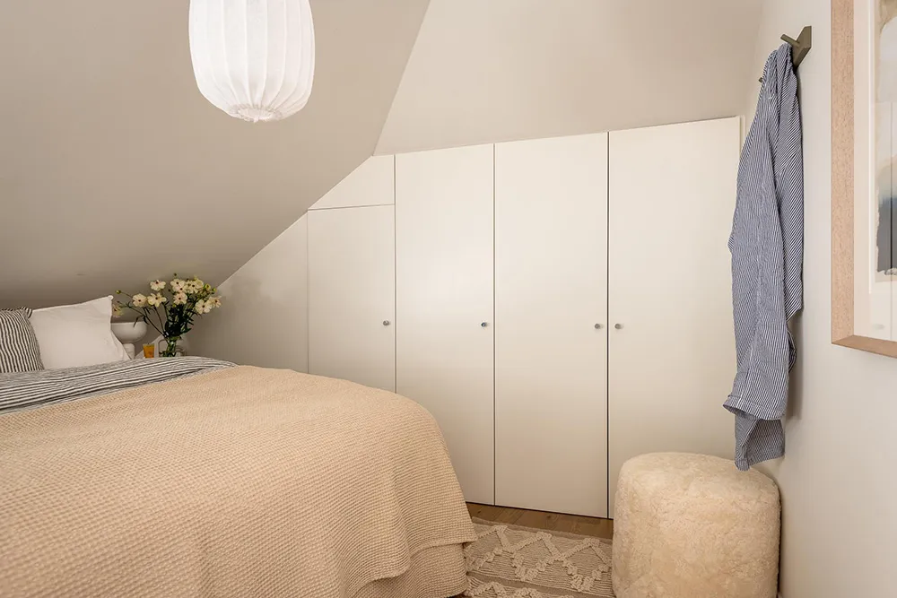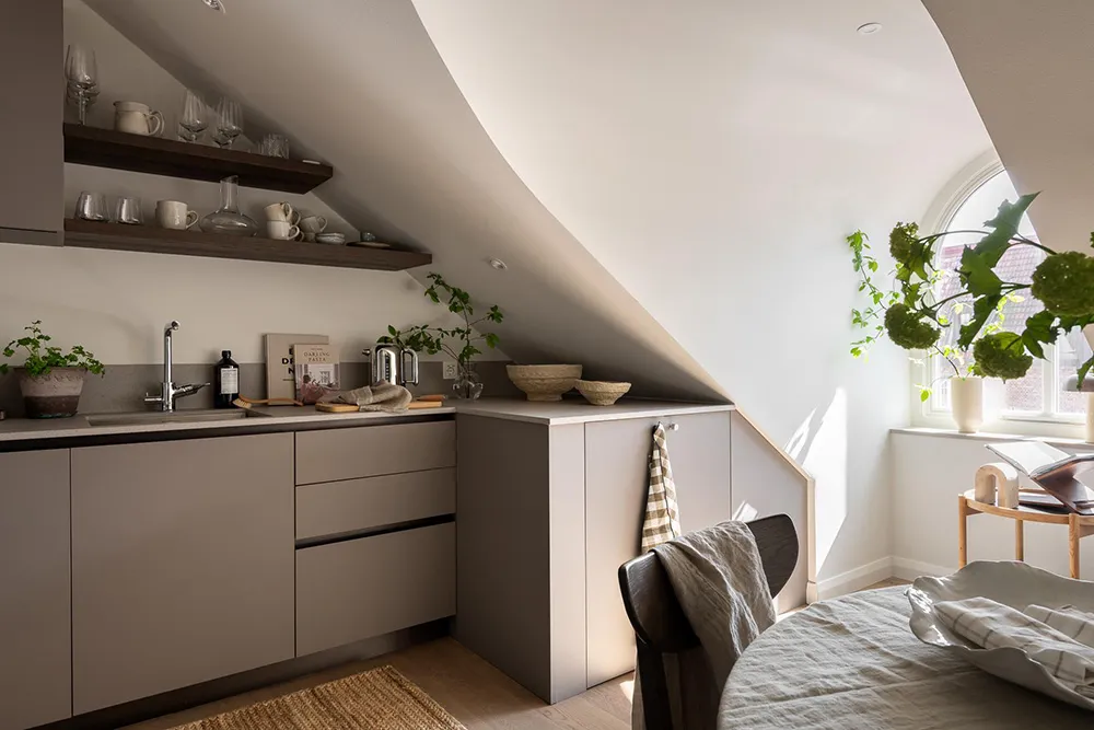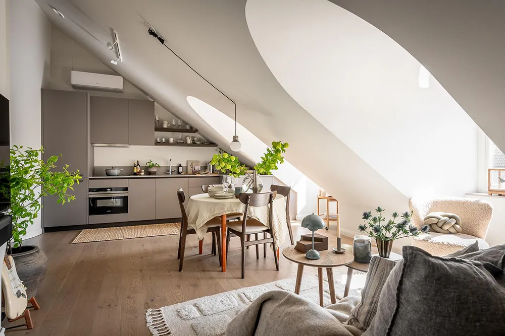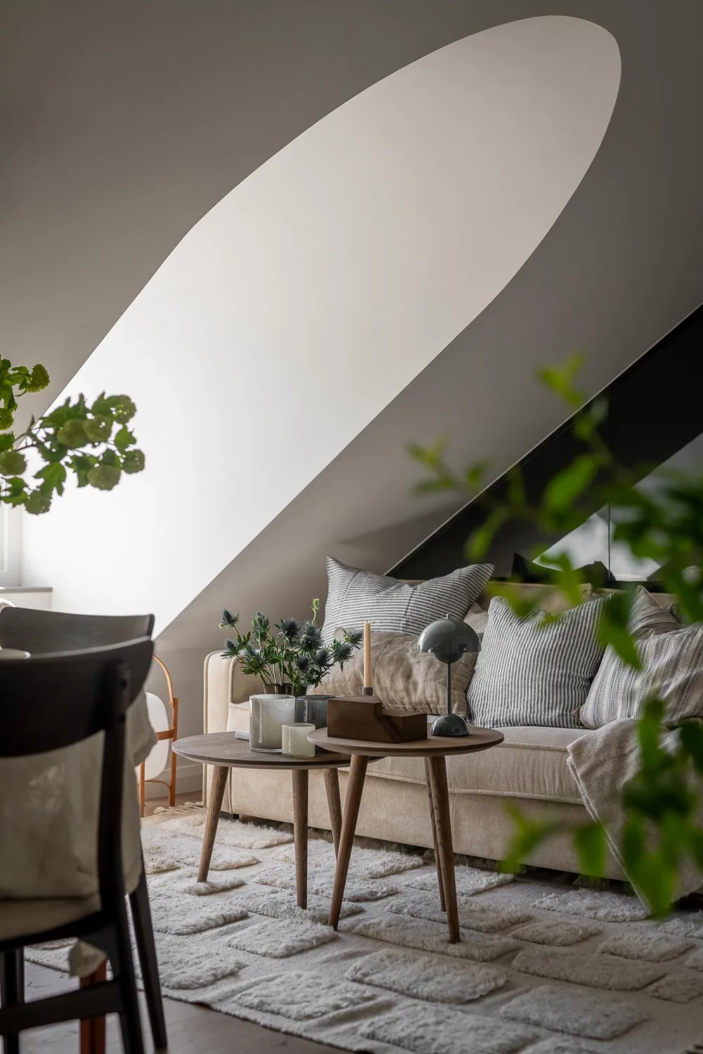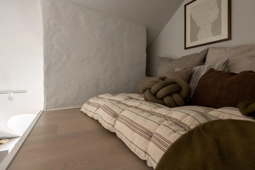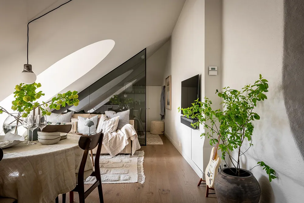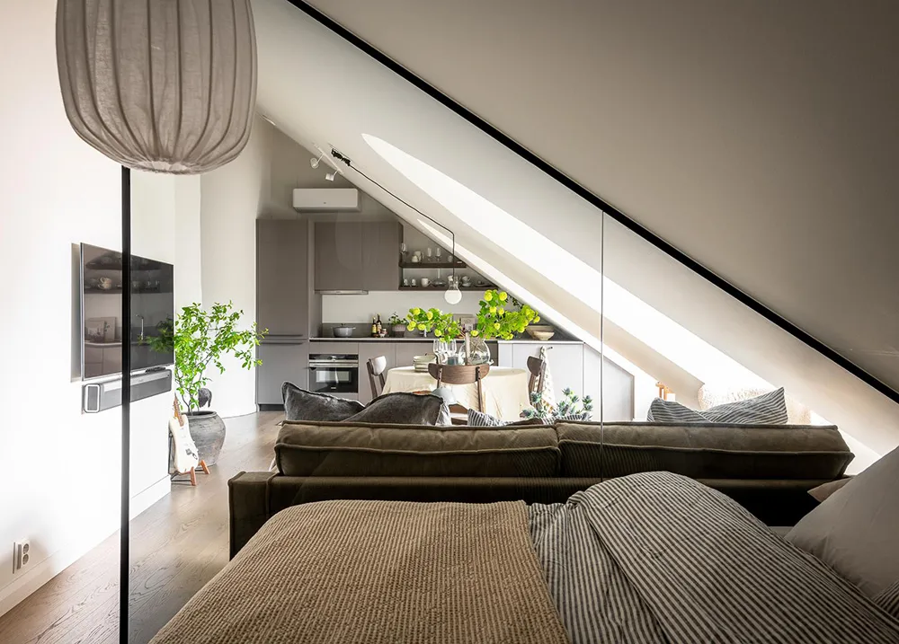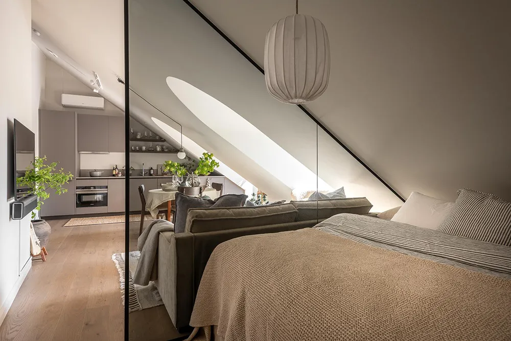 Small minimalist attic with bedroom behind glass (34 sq. m)