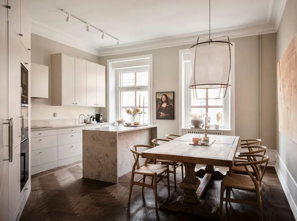 Beige Walls and the Mona Lisa on the Kitchen Wall: Spacious Apartment in Gothenburg
