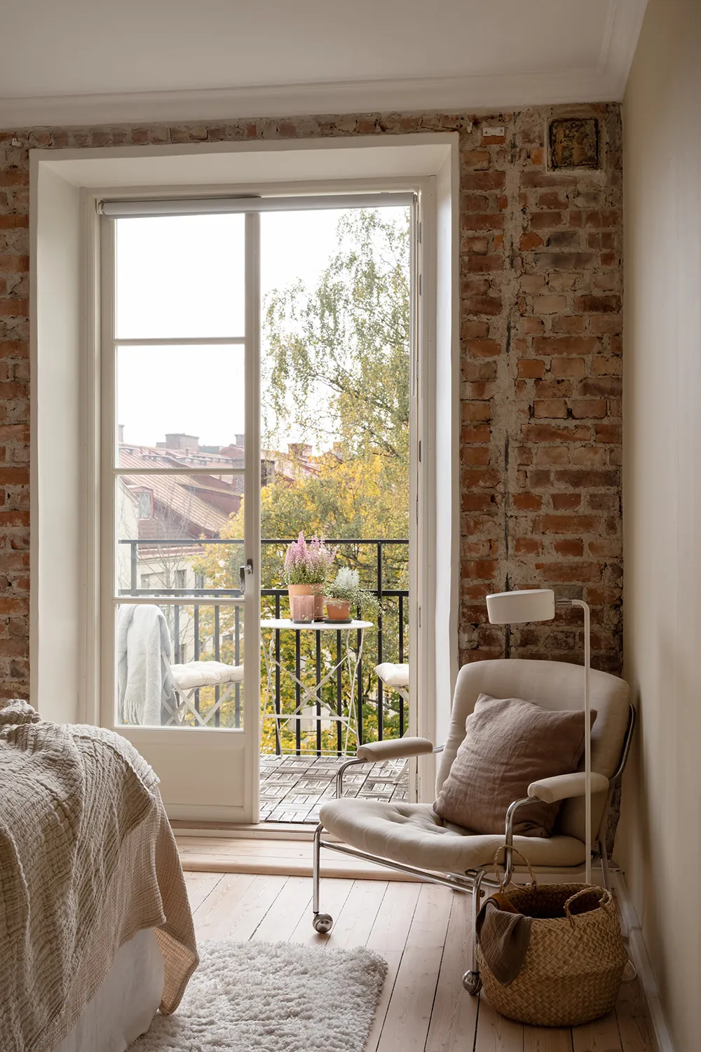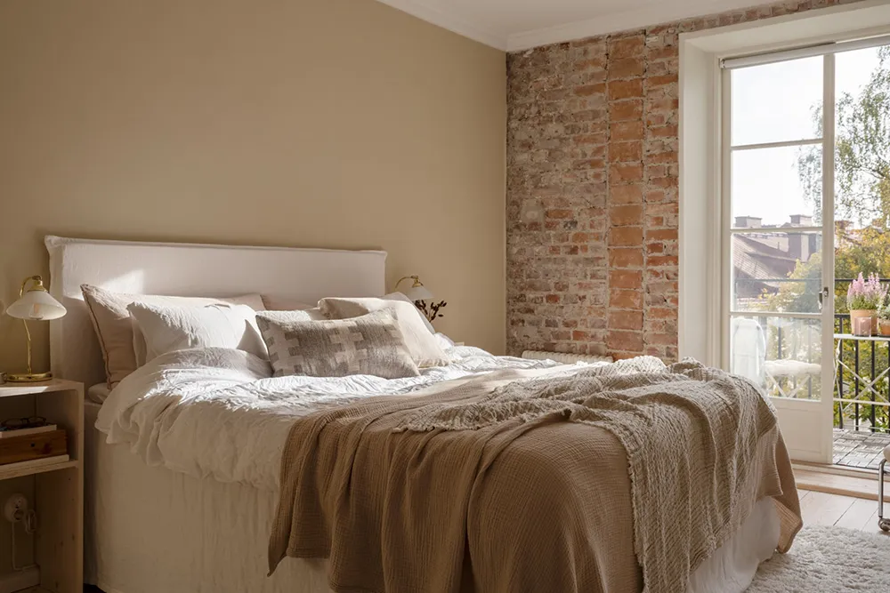 Large Bookcase and Brick Wall in Bedroom: Apartment in Gothenburg (62 sqm)
