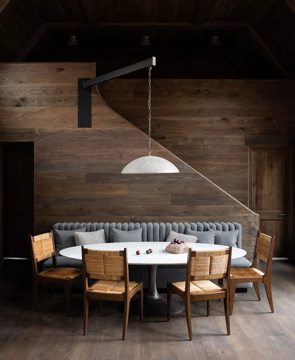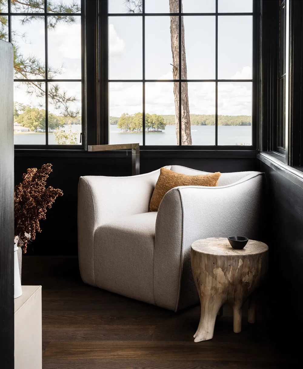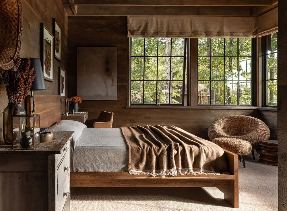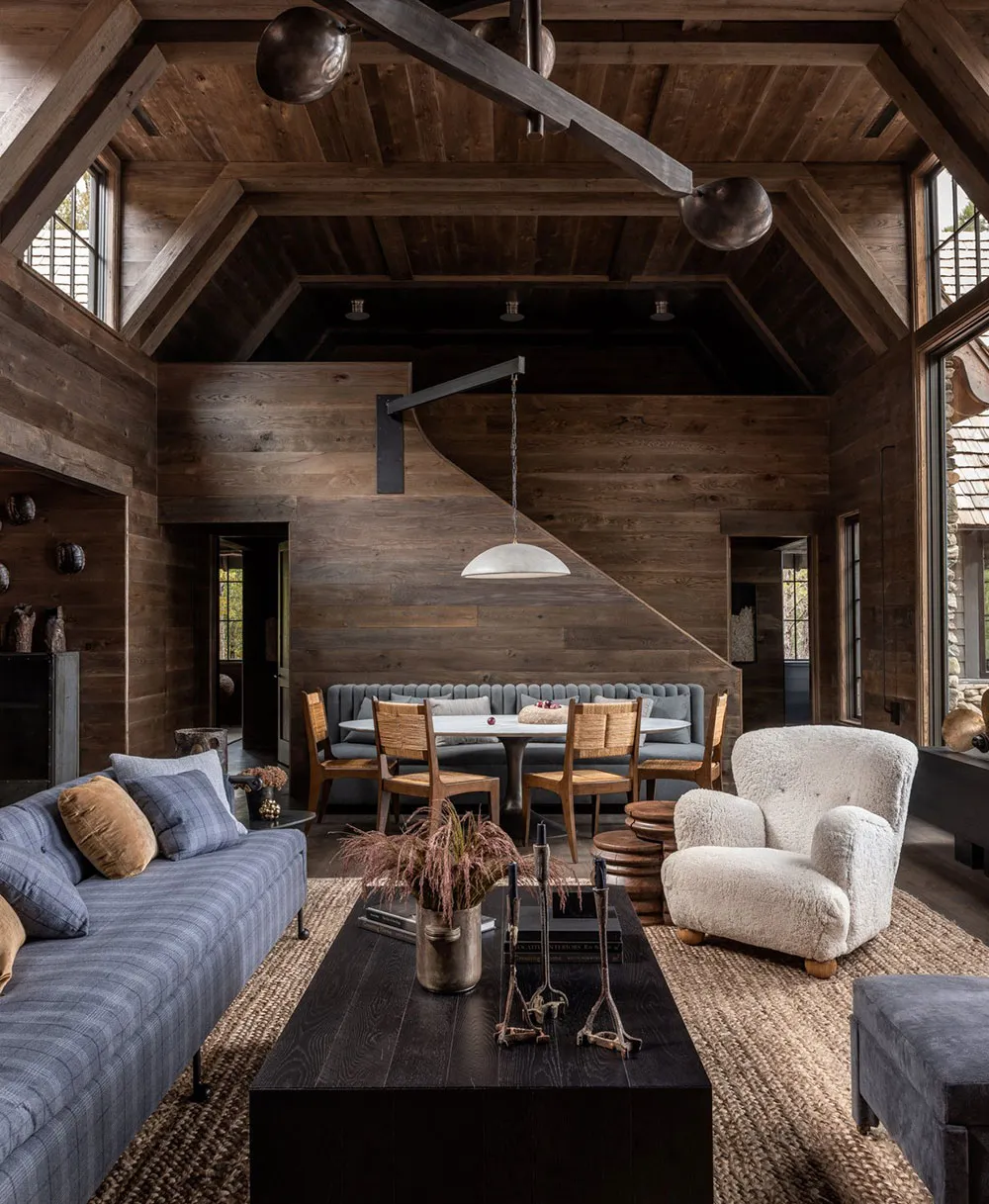 The interiors of this wooden barn-style house by the lake in the state of Alabama turned out to be contrasting and atmospheric, but not due to color palette, but thanks to natural materials in the finishing.