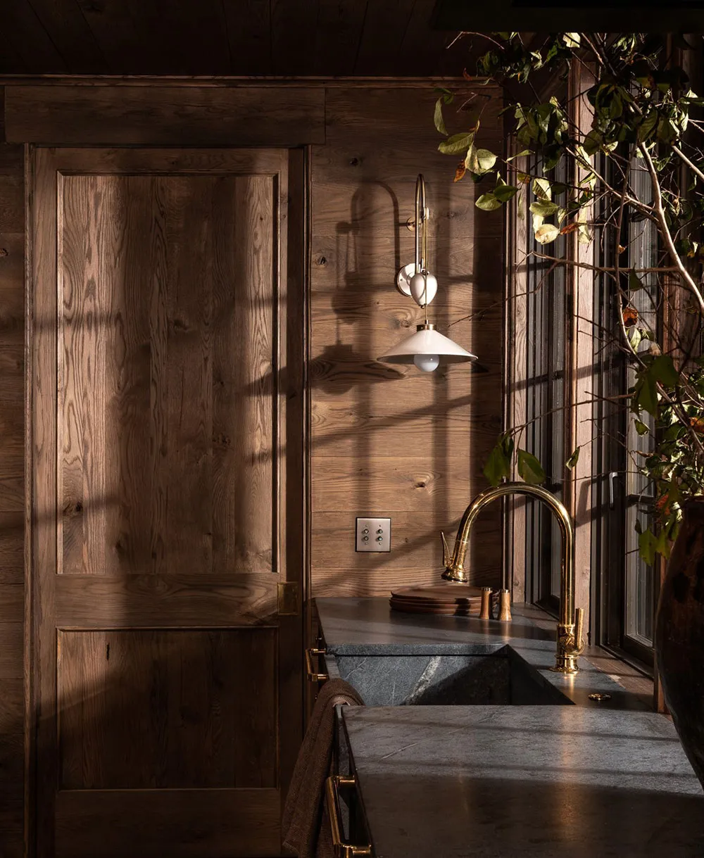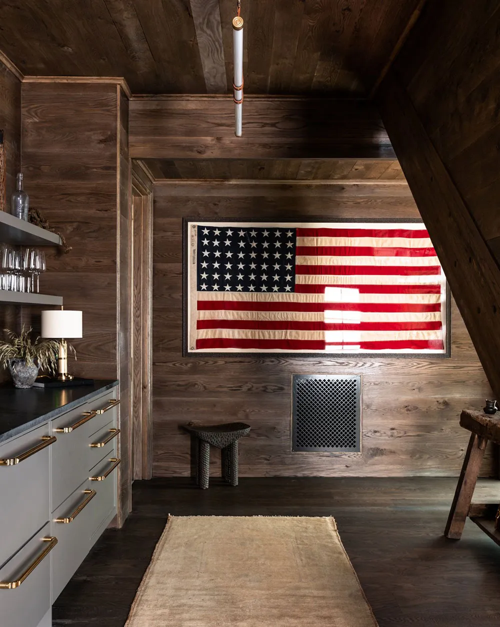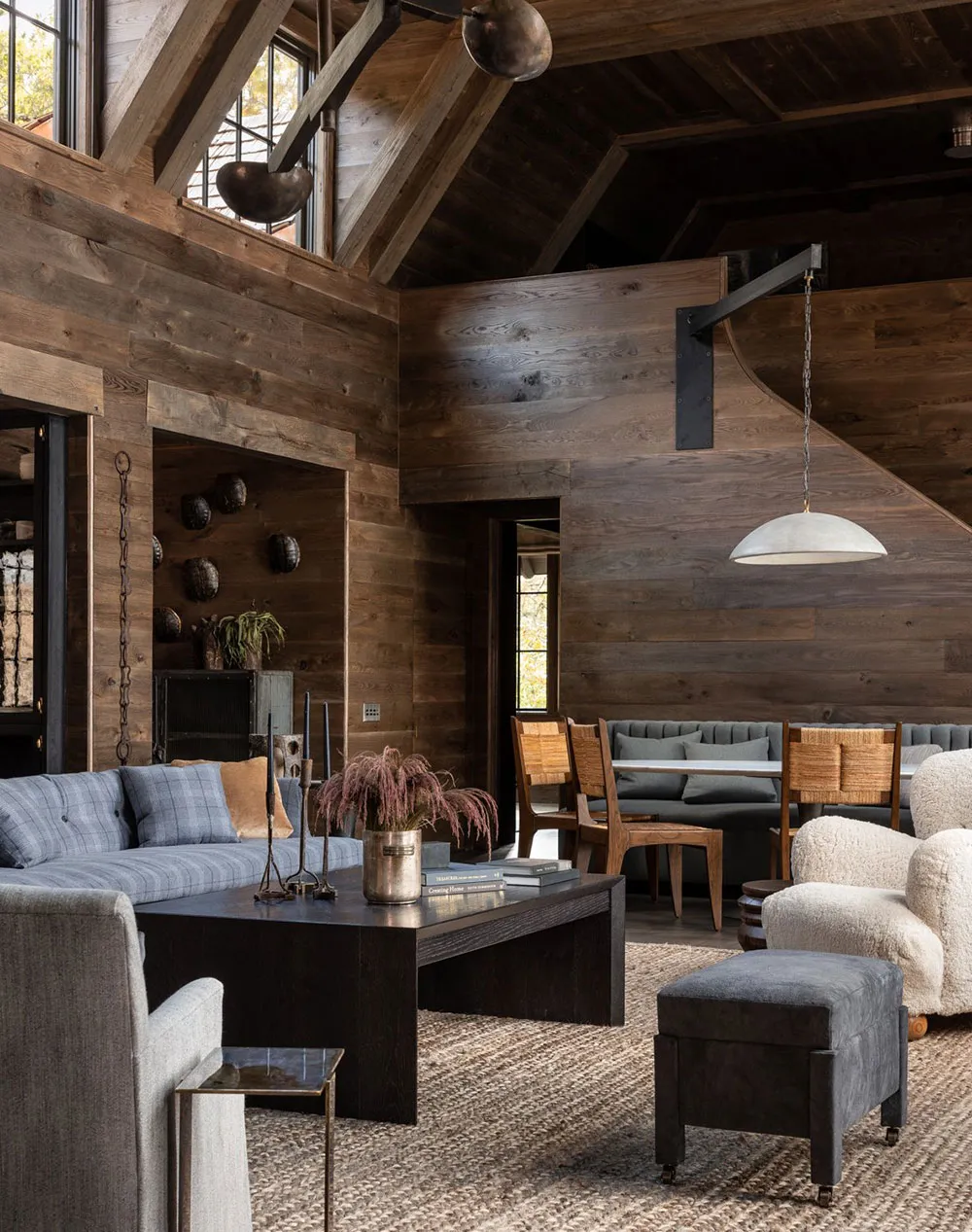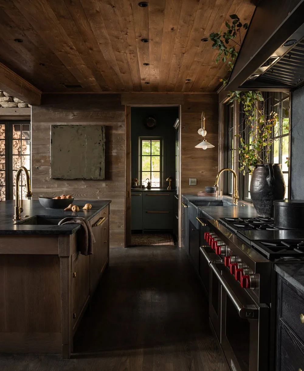 The interiors of this wooden barn-style house by the lake in the state of Alabama turned out to be contrasting and atmospheric, but not due to color palette, but thanks to natural materials in the finishing.