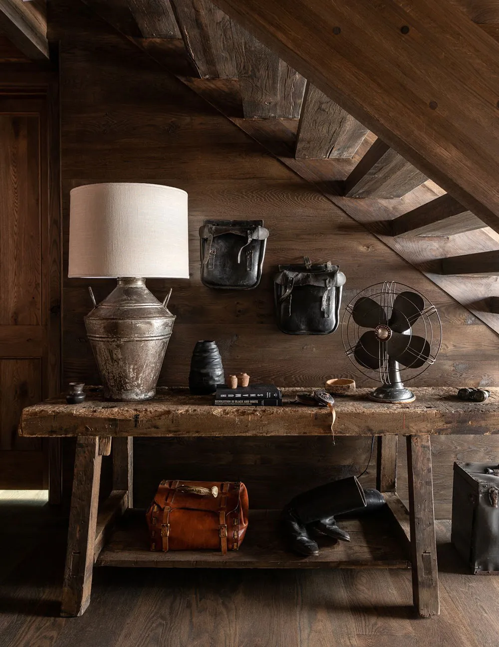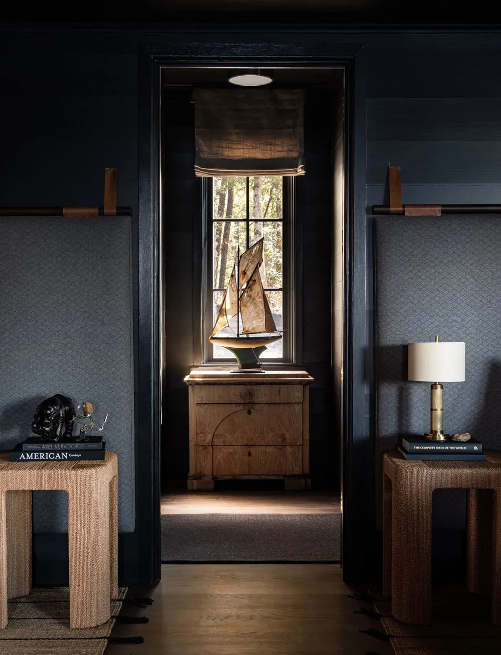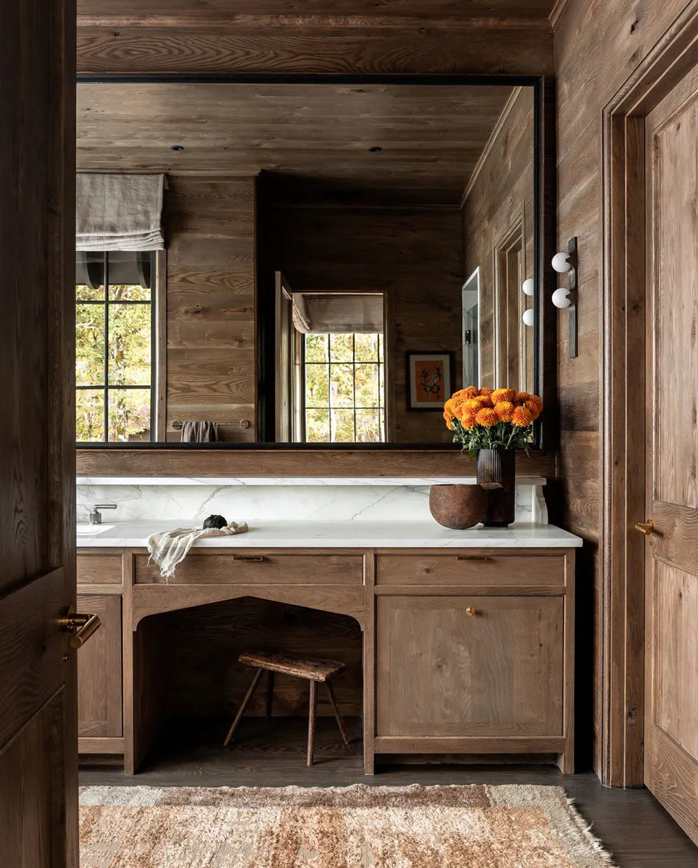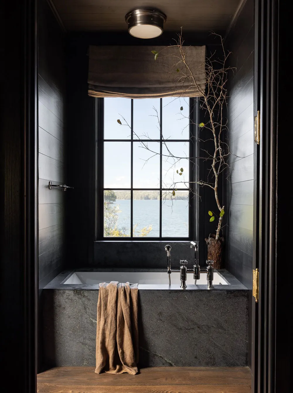 The interiors of this wooden barn-style house by the lake in the state of Alabama turned out to be contrasting and atmospheric, but not due to color palette, but thanks to natural materials in the finishing.