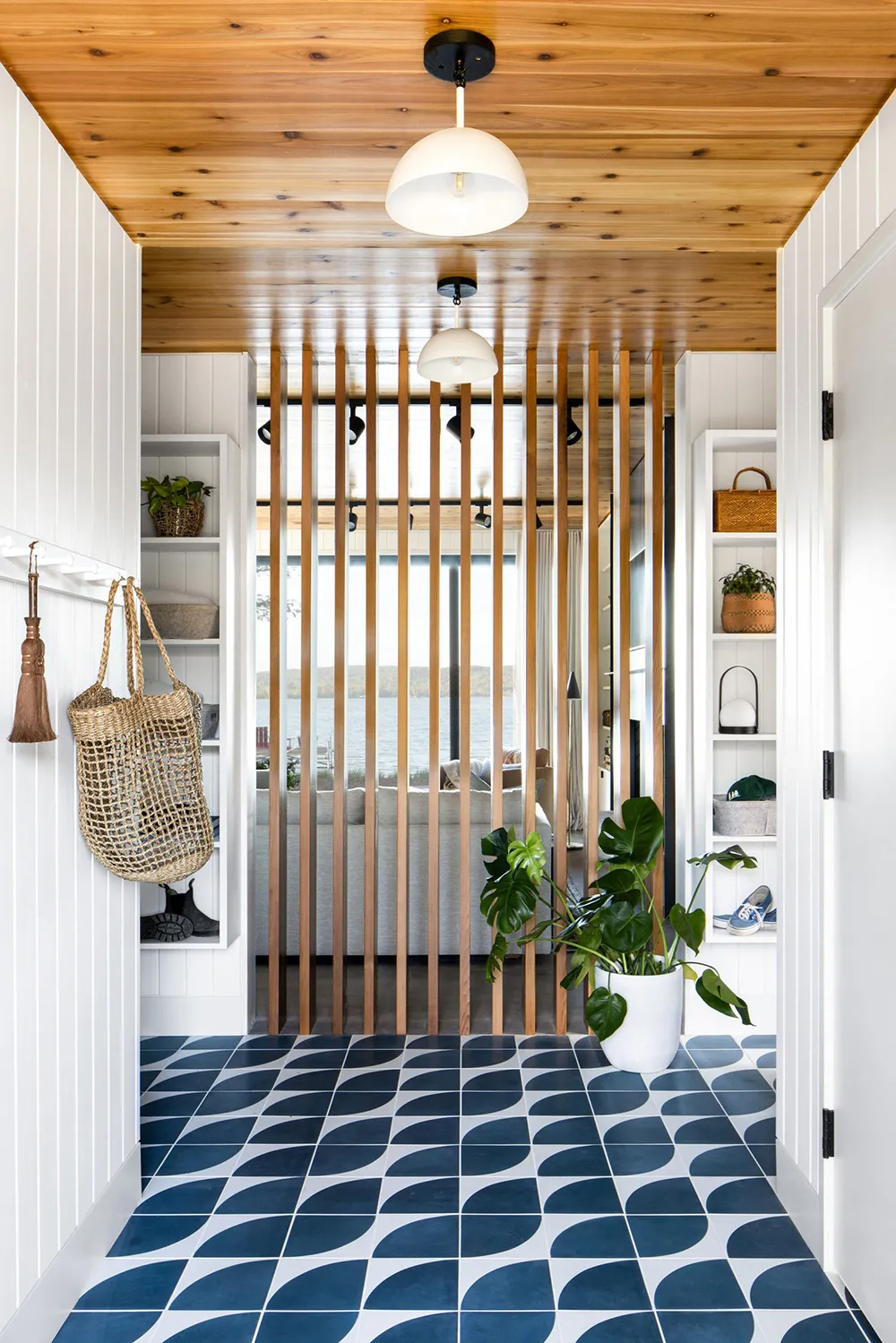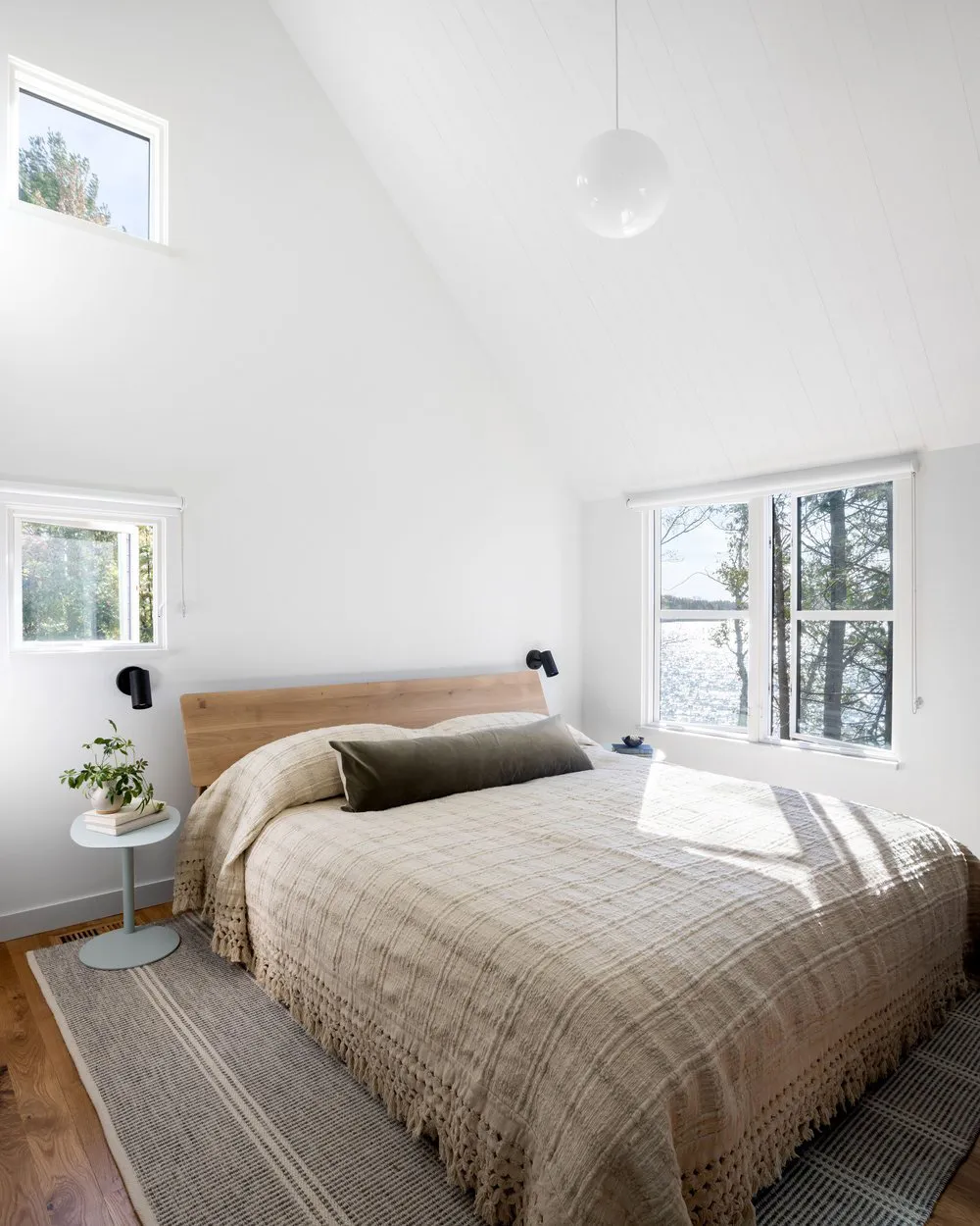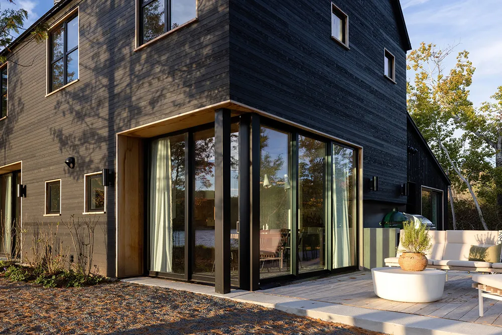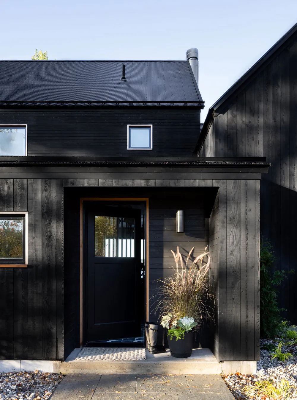 This modern cottage with a striking black facade is perfectly situated on the edge of a forest, just steps away from a scenic lake in Maine.