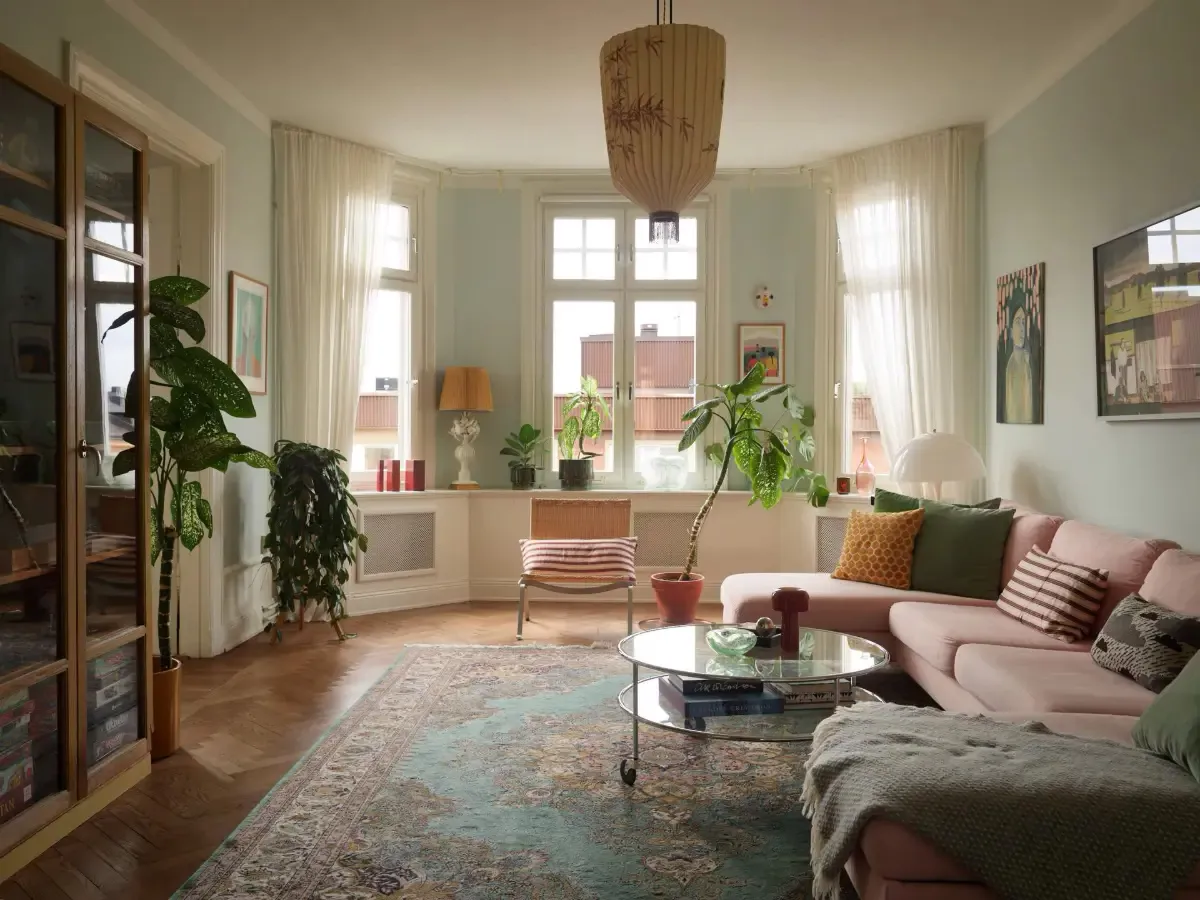 Soft Blue Walls and Pink Sofa: Pleasant Living Interior in Stockholm