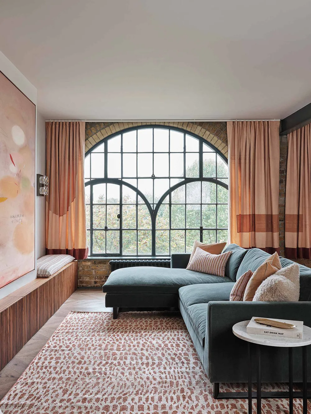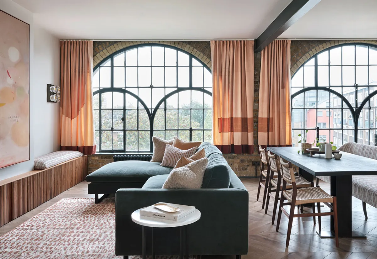 Two luxurious arched windows make the open living room of this small loft apartment in London very impressive.