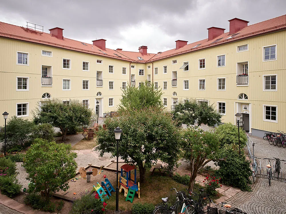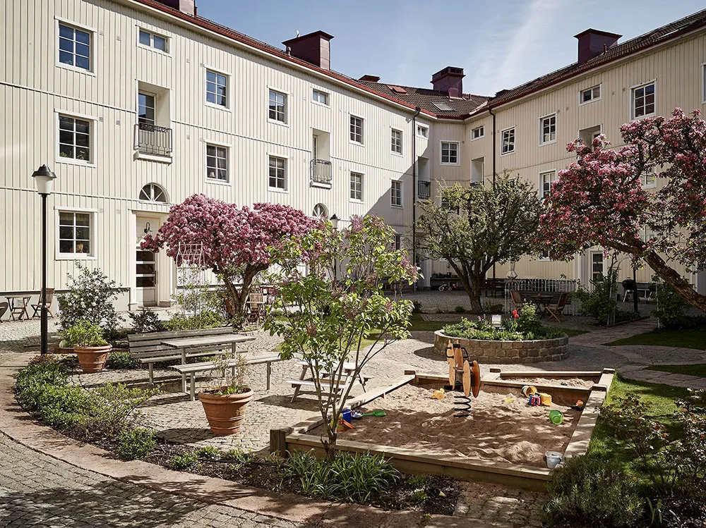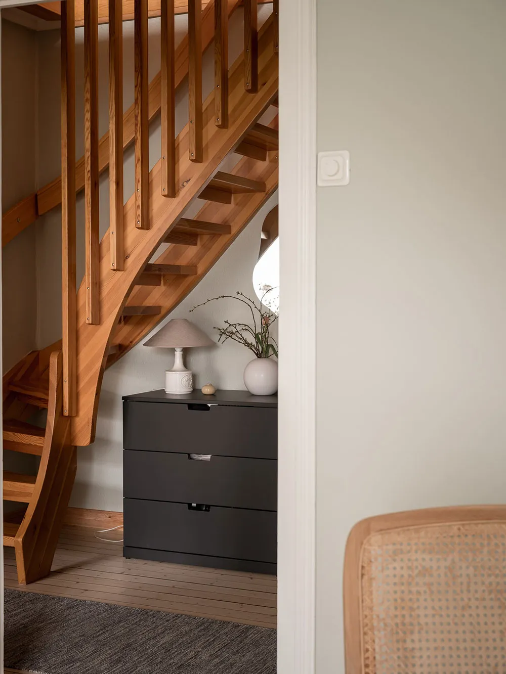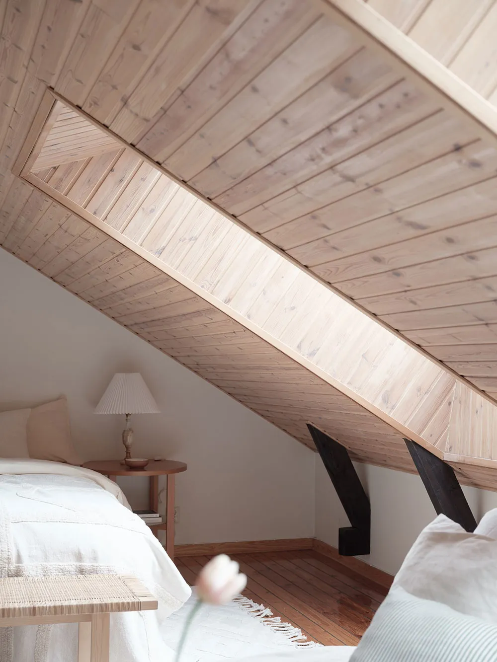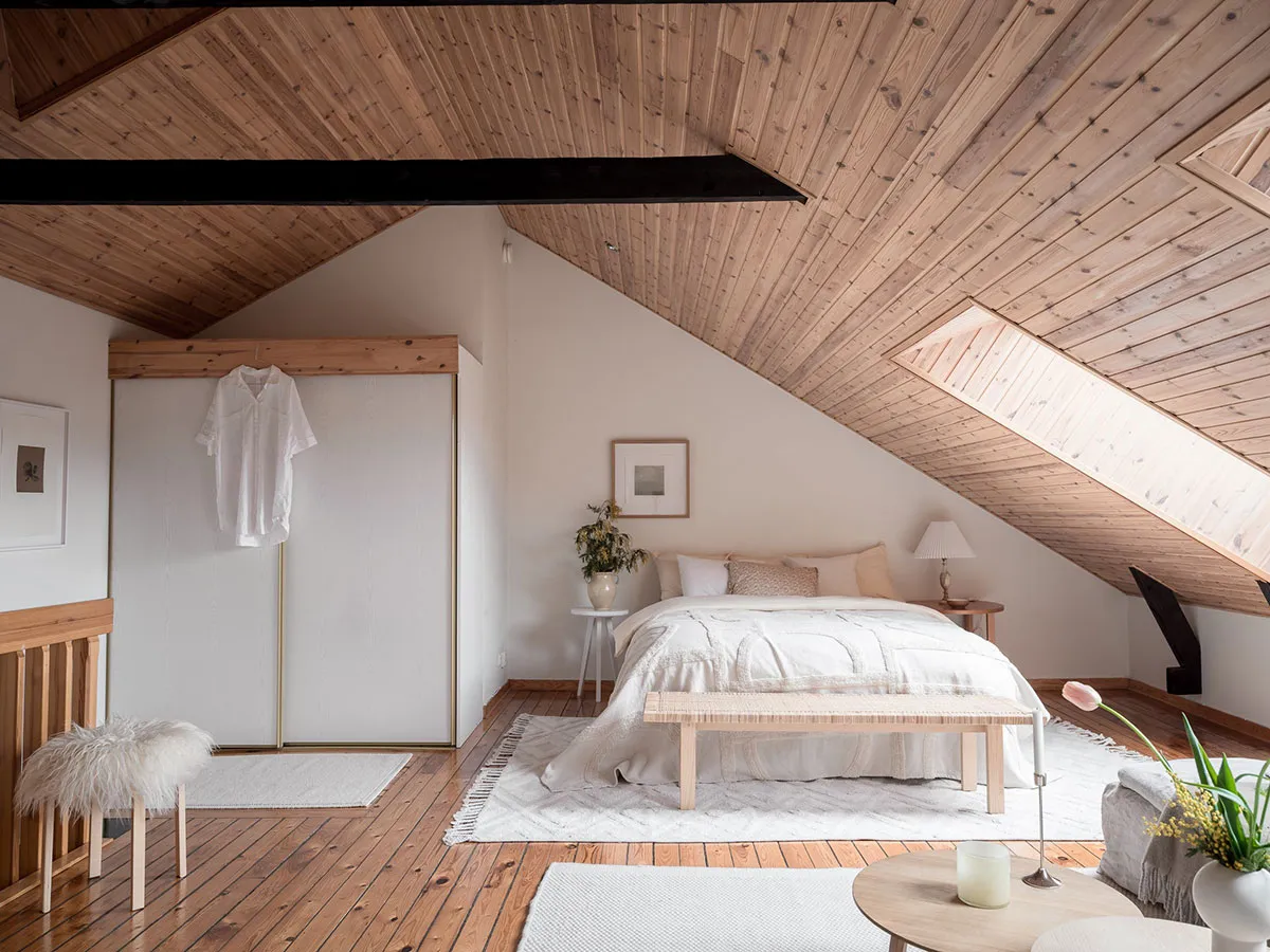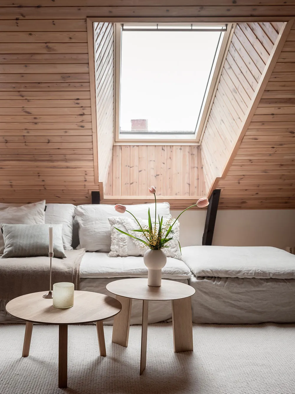 The ceiling of this loft apartment in Sweden is lined with wooden paneling — thus, even more warmth was added to the interiors, and the atmosphere evokes thoughts of a countryside cottage.