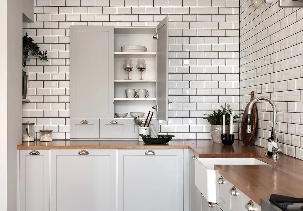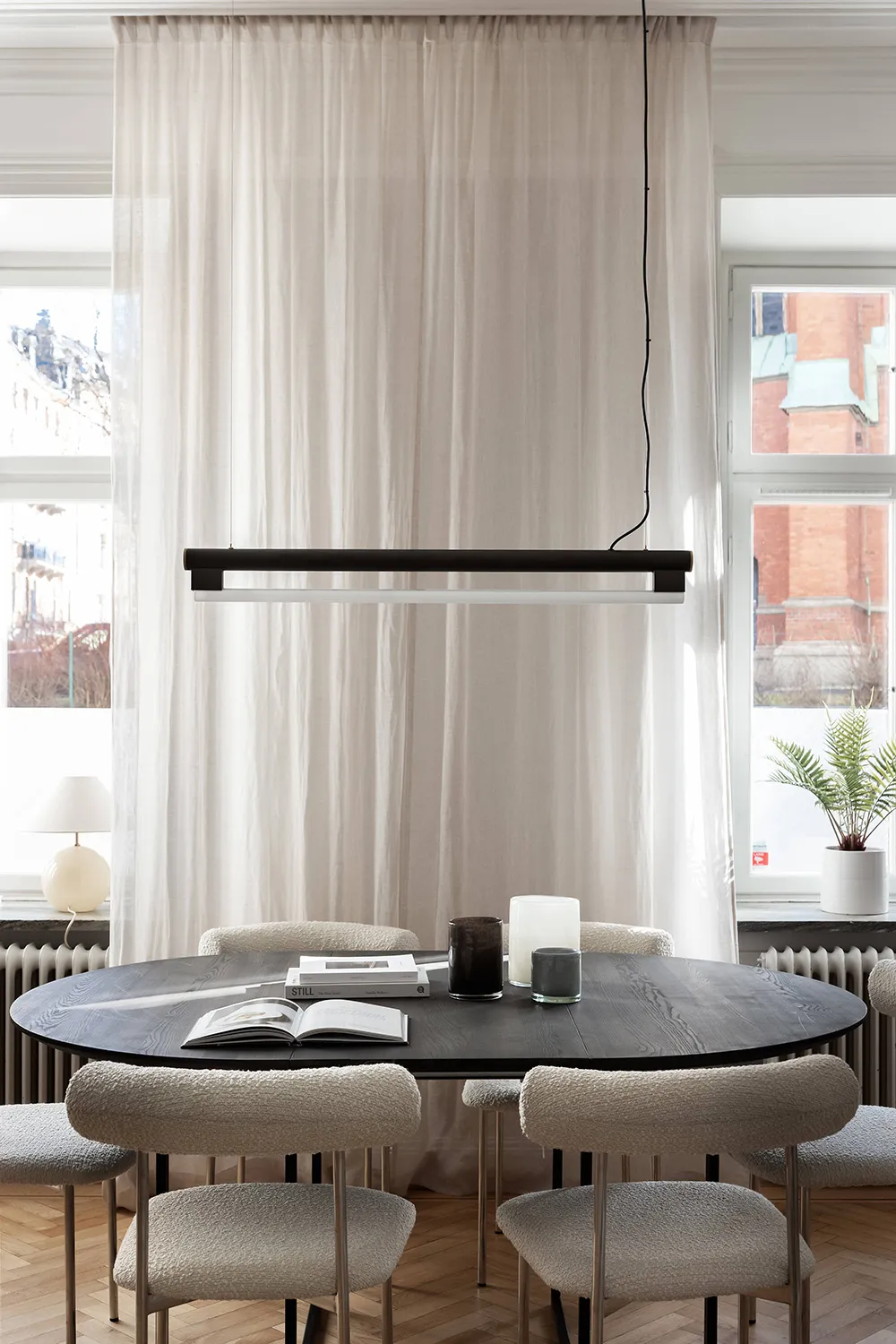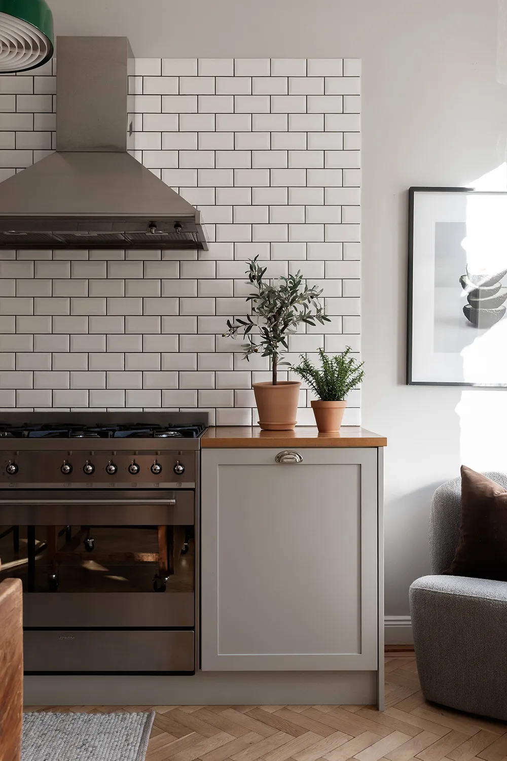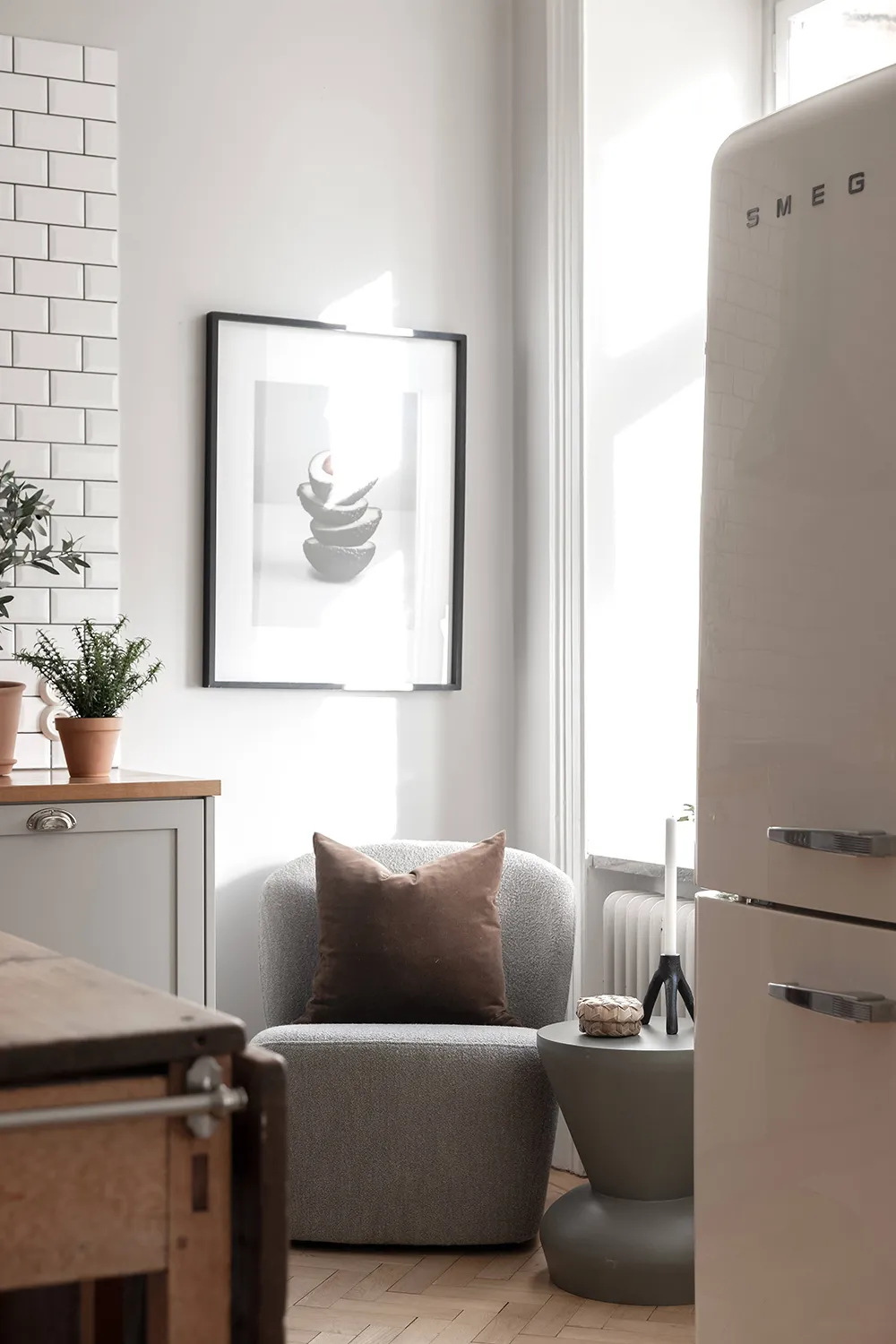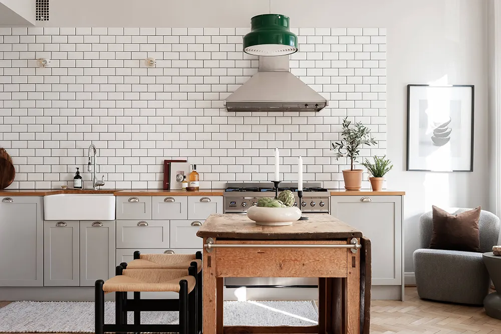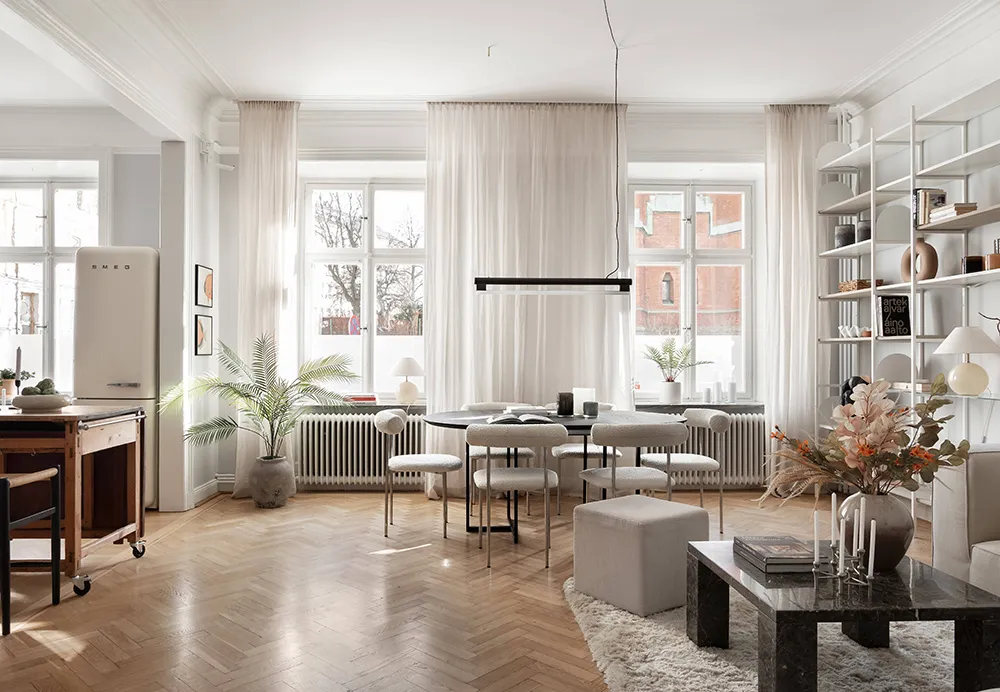 Despite the fact that this apartment is located in a 100-year-old building in Stockholm, designers managed to combine the kitchen and living room into one beautiful open shared space with three large windows and a sea of natural light.