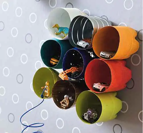 Por ejemplo, todos compramos constantemente bebidas en botellas de plástico. No hay que tirarlas tan pronto. Por supuesto, ya las usaste como jarrones, en algunos casos, pero también pueden ser contenedores de pequeños artículos. ¿Cómo hacerlo? Muy fácil. Solo necesitas cortar el cuello de la botella, pintar la parte inferior restante con diferentes colores resistentes al agua, dejar que se seque bien. Si quieres, puedes cubrir todo esto con barniz por encima. Luego fija tu creación a la pared y listo, todo está listo.