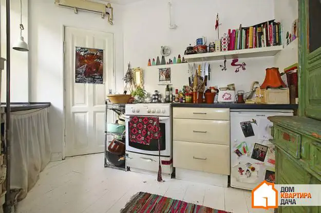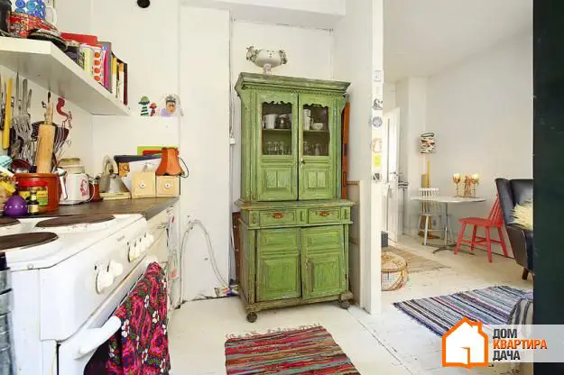 La cocina de este apartamento, como en muchos otros modelos estándar, tenía salida al pasillo. Lo llenaron y en la nicho apareció un mueble antiguo del siglo XIX. Se integró perfectamente con el tamaño y se convirtió en el elemento destacado del interior de la habitación.