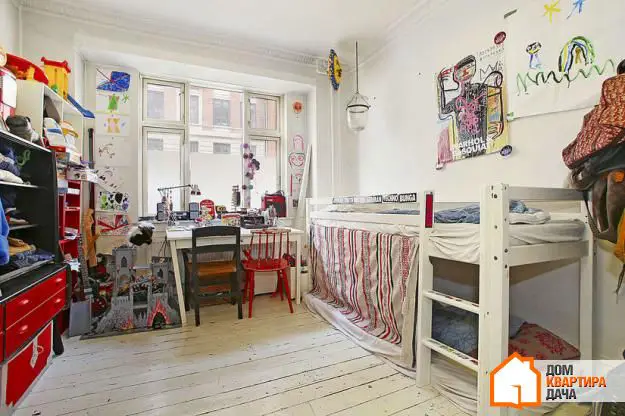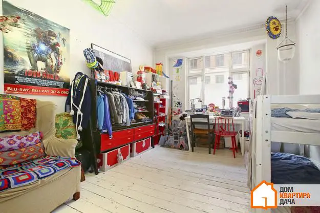 En esta habitación, a pesar de la abundancia de objetos pequeños, todavía hay orden. Todos los juguetes pequeños se guardan en dos cajas especiales en el suelo bajo el armario. Los demás están en estantería o en la ventana. Solo los candados y guitarras de juguete están en el suelo, ya que no cabían en otro lugar. Por toda la habitación cuelgan dibujos del niño, lo que mejora mucho el ambiente. Junto al escritorio hay dos sillas: una para el niño y otra para la madre, quien lo ayuda con las tareas escolares.