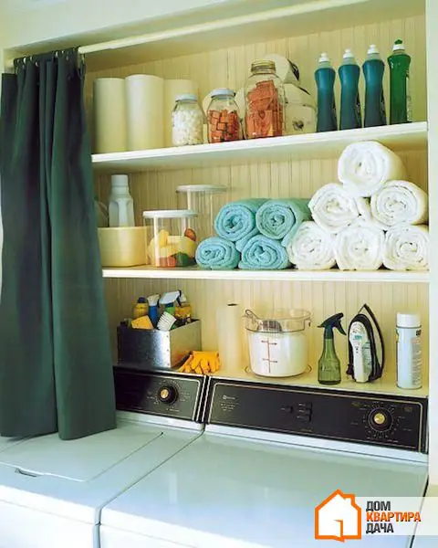 No puedes ordenar los estantes abiertos llenos de cosas? Coloca una bonita cortina en el soporte con muelles: esta será una excelente sustitución para la puerta. Una buena opción son armarios y mesas con cajones opacos: estos harán que la habitación parezca más ordenada.