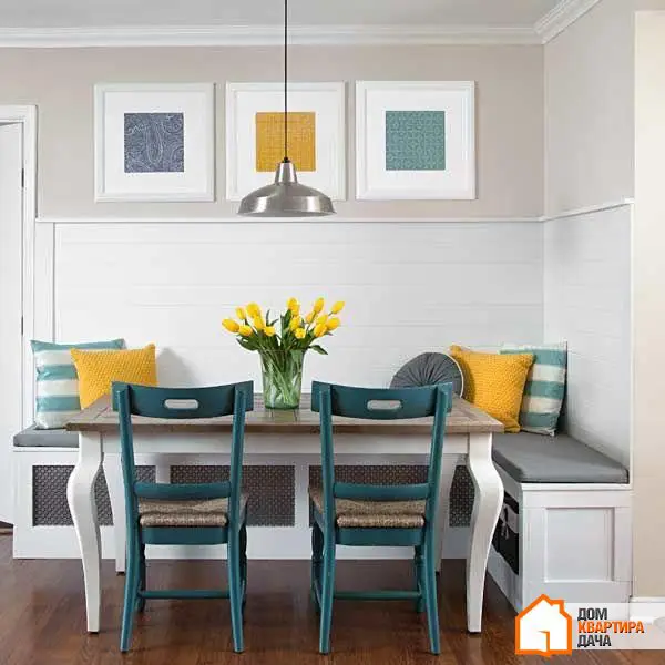 En contra de los estereotipos, una banca en lugar del sofá no es una extravagancia para decorar una habitación grande, sino una oportunidad de crear un espacio de descanso en un área estrecha. Es fácil integrarla en la esquina de la zona de comedor, y así el espacio alrededor de la mesa será incluso más espacioso que si hubiera sillas en su lugar.