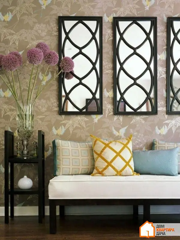 Evita tentación de colgar un espejo horizontal en la sala de estar: aunque sea una forma conveniente de resolver el problema de decorar una pared, un espejo vertical sí logra con mayor eficacia la tarea más importante para espacios pequeños — elevar visualmente la altura de las paredes.