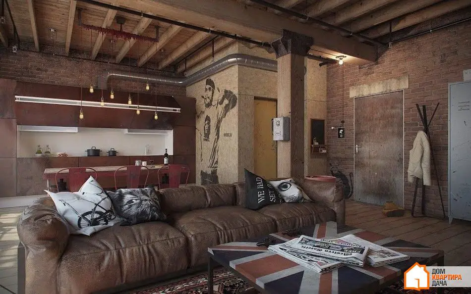 Este loft podría considerarse clásico si no fuera por su espacio reducido. El diseño resultante se ajusta perfectamente a un joven soltero: sin armarios excesivos, con un sofá plegable y elementos rústicos en la decoración.