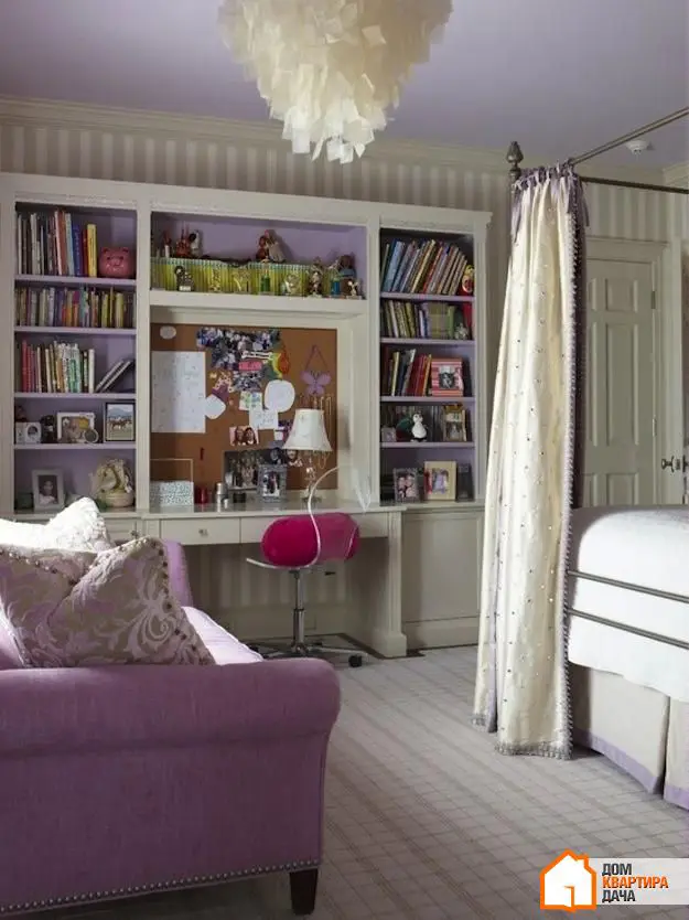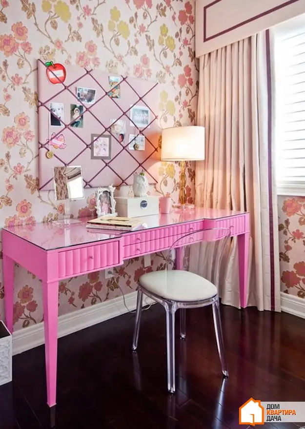 Aunque la decoración es muy importante, la funcionalidad debe seguir siendo lo más prioritario. En la habitación de una adolescente debe haber un lugar de trabajo cómodo, ubicado cerca de la ventana. El escritorio debe estar complementado con estantes, repisas y cajones para almacenar libros de texto, libros y artículos de papelería.