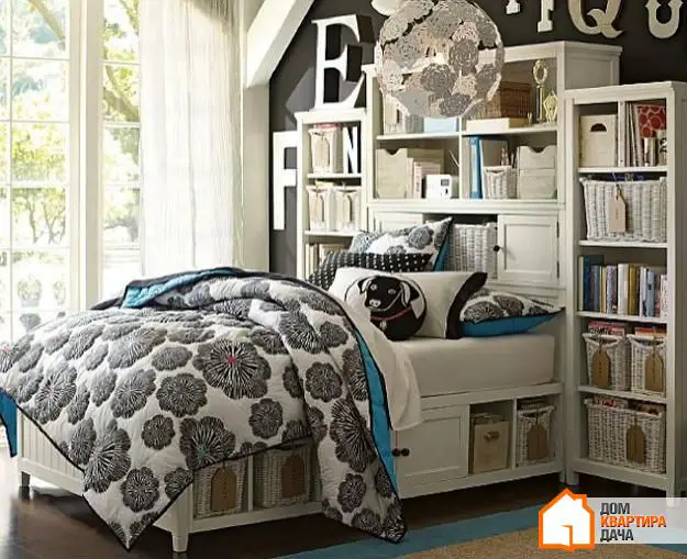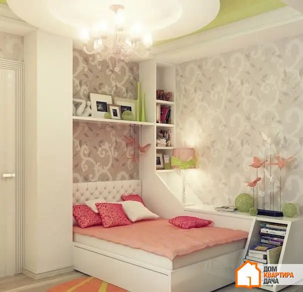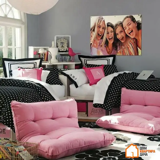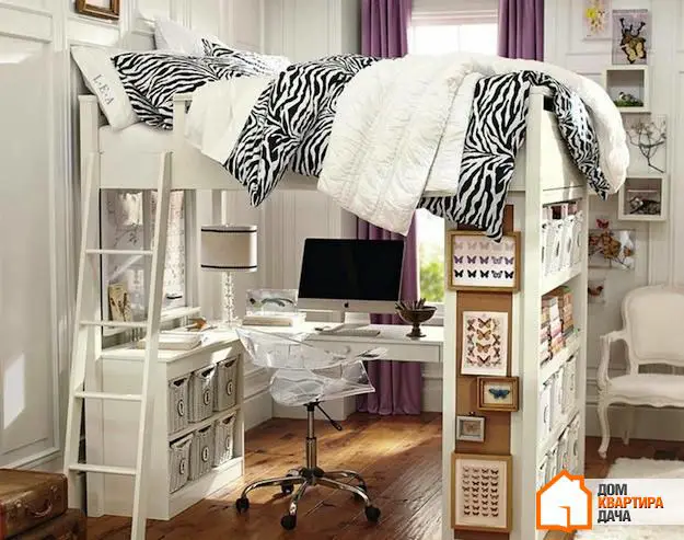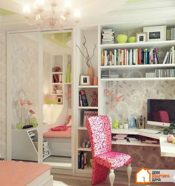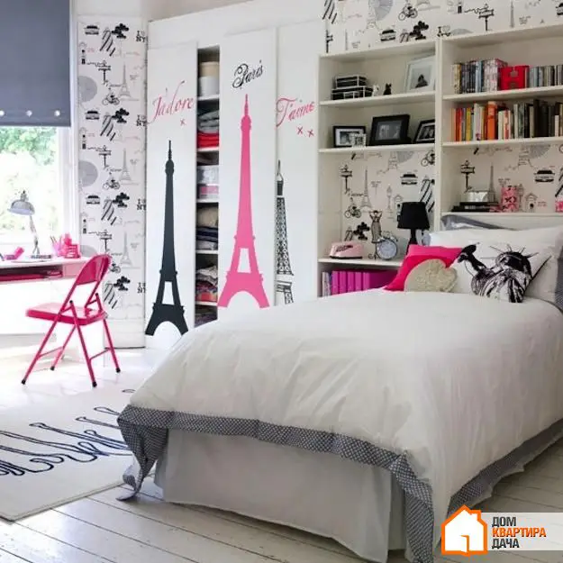 Ahora, en la toma de decisiones sobre el diseño de su propia habitación, participa también la misma niña adolescente, no solo sus padres. Porque el dormitorio de una adolescente es un lugar de aislamiento con una atmósfera cómoda para estudiar, descansar y comunicarse con amigos. Por lo tanto, todo debe corresponder a los intereses y aficiones de la dueña de la habitación; aquí debe manifestarse su individualidad y espíritu creativo.