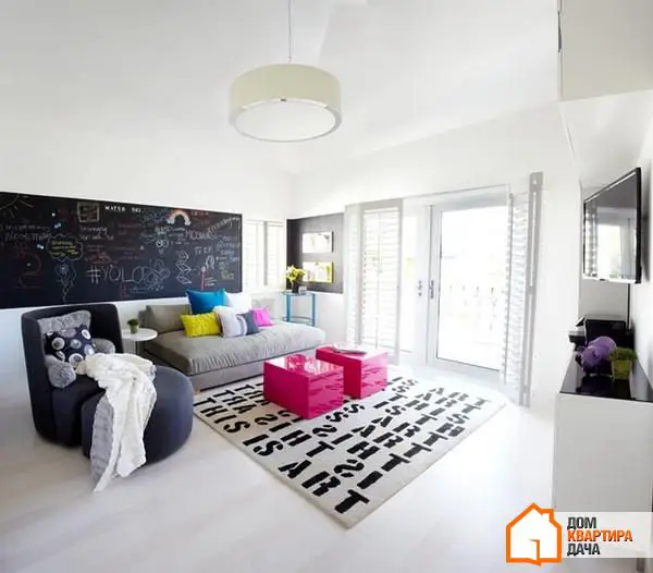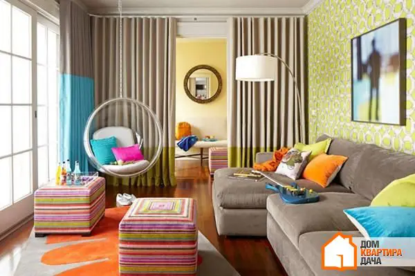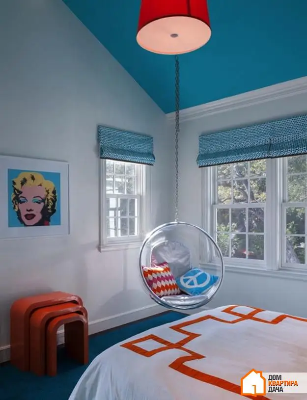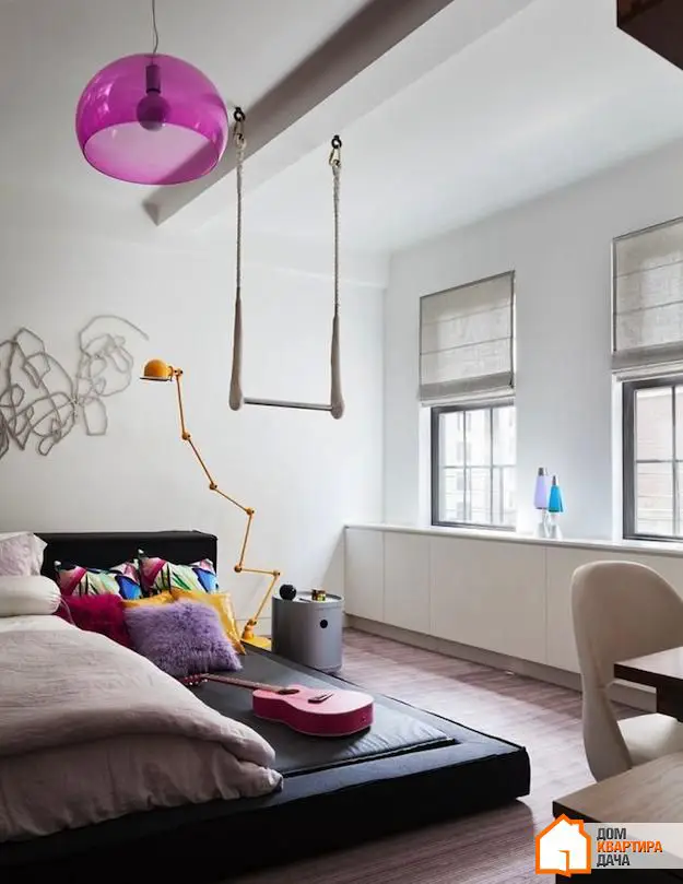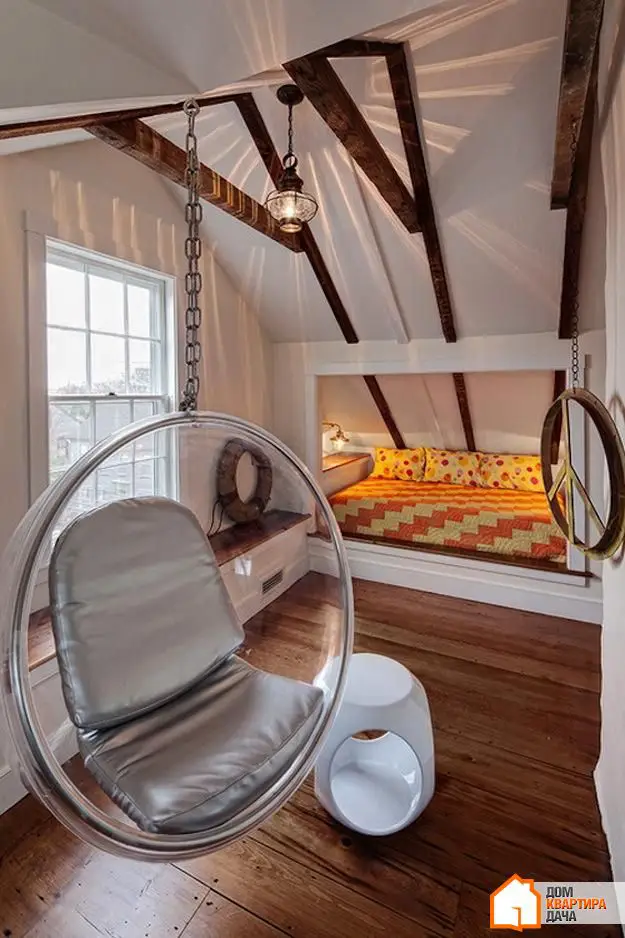 sillón-mochila (gracias a su movilidad, es una cosa muy útil para habitaciones pequeñas); sillón colgante o mecedora (ten cuidado con el método de montaje - consulta con un especialista); tablones o plataformas; banco blando al lado de la ventana, donde a menudo se esconden cajas espaciosas.
