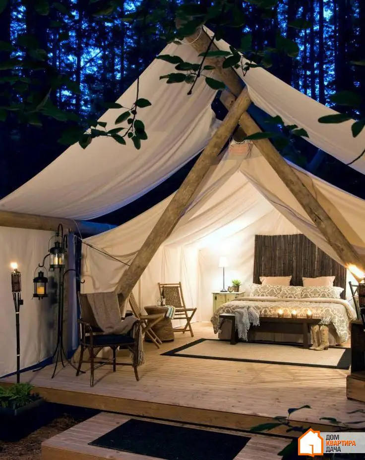 12. Cuando hablamos de campamento, no es exactamente lo que viene a la mente. Más bien parece un camping glamoroso, ya que este estilo de descanso en la naturaleza con una gran elegancia y lujo sería ideal para los amantes de la riqueza y el esplendor. Como si llevara toda su habitación de dormitorio al bosque.