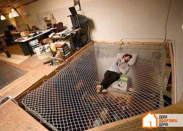 7. Una cama en forma de hamaca también es sin duda una excelente opción para un dormitorio de sueños. Este diseño que elegimos es simple y muy cómodo para crear un espacio de descanso inusual. Además, este método de colocación del colchón resalta perfectamente el gusto singular del dueño de la casa.