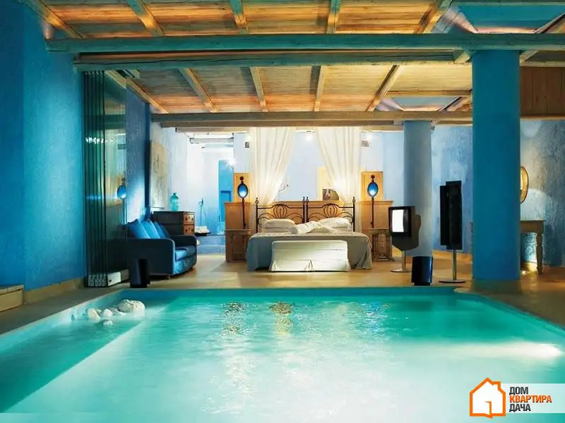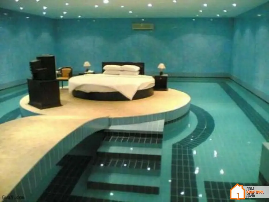 14. Aquí se concretó prácticamente la misma idea, pero en una interpretación completamente diferente: no es una piscina dentro del dormitorio, sino más bien un dormitorio dentro de una piscina. Donde la cama circular está colocada sobre una isla en el centro de la piscina.