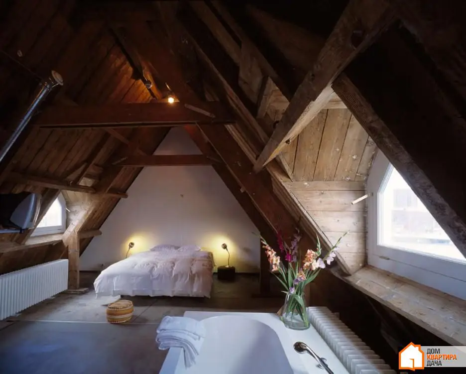 19. A veces queremos algo simple, rústico con un diseño tradicional comprobado durante años. Dejemos los lujos y disfrutemos de un dormitorio con techo de madera inclinado, vigas interiores y una belleza ascética real.