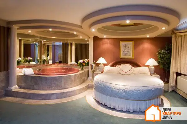 17. Un dormitorio de lujo con una cama redonda, una gran jacuzzi y un decorado romántico íntimo.