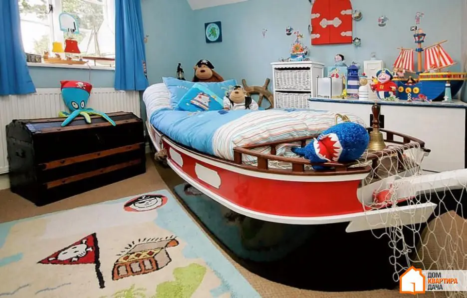 23. Si hablamos de dormitorios infantiles divertidos e interesantes, una idea puede ser la temática pirata marina. Aquí encontrará una cama en forma de barco, un puente de almacenamiento de madera y por supuesto los colores adecuados para el interior.