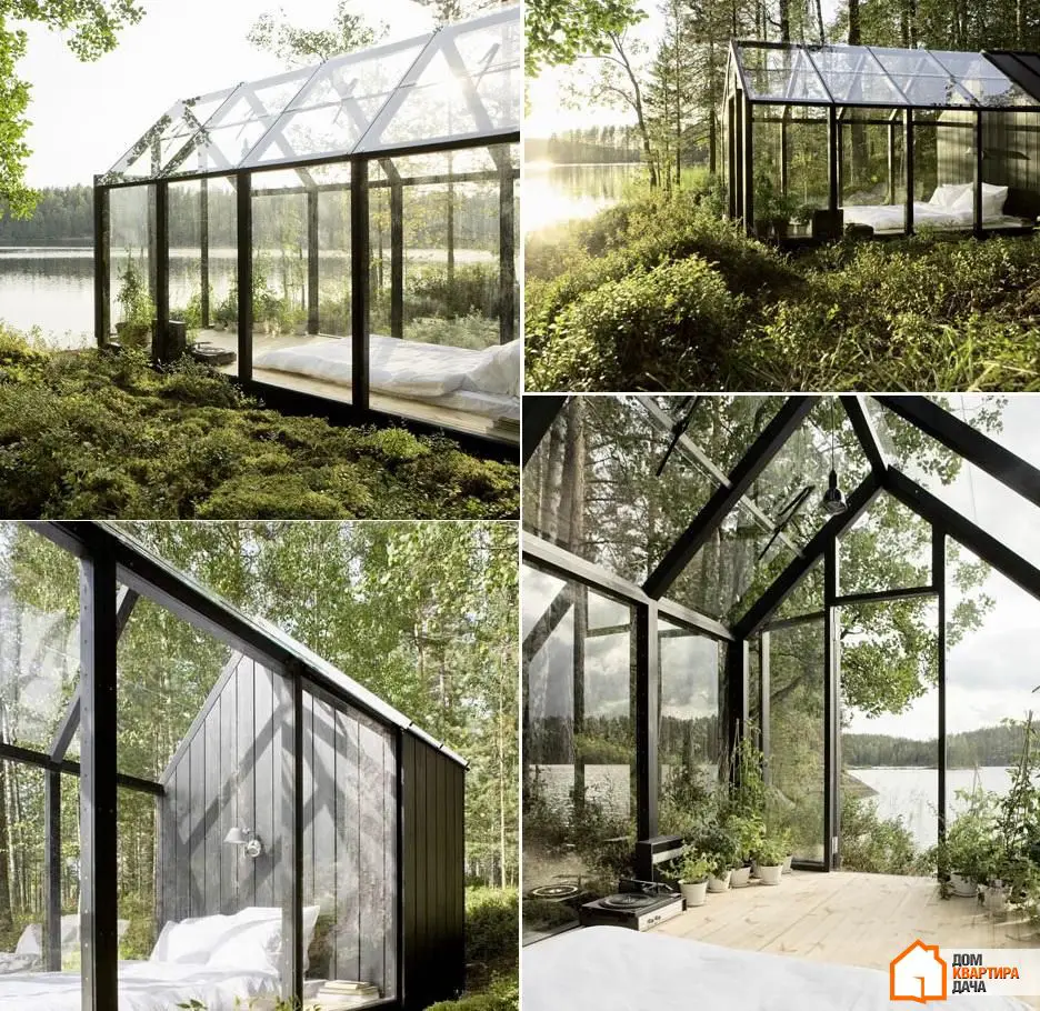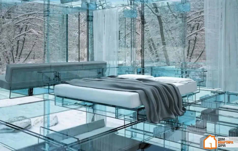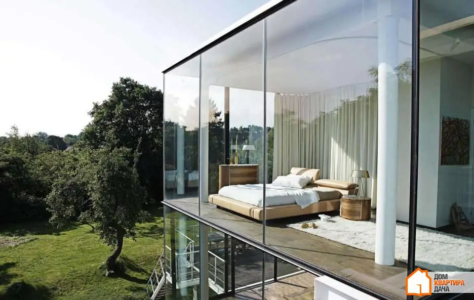 1. Un dormitorio encerrado en vidrio se parece mucho al estilo de la«casa verde», pero lo hace mucho más interesante el entorno natural que sin él no tiene sentido construir un dormitorio así. Por supuesto, en una habitación como esta se sentirá bastante expuesto, pero si se trata de su propio jardín, eso no será un obstáculo.