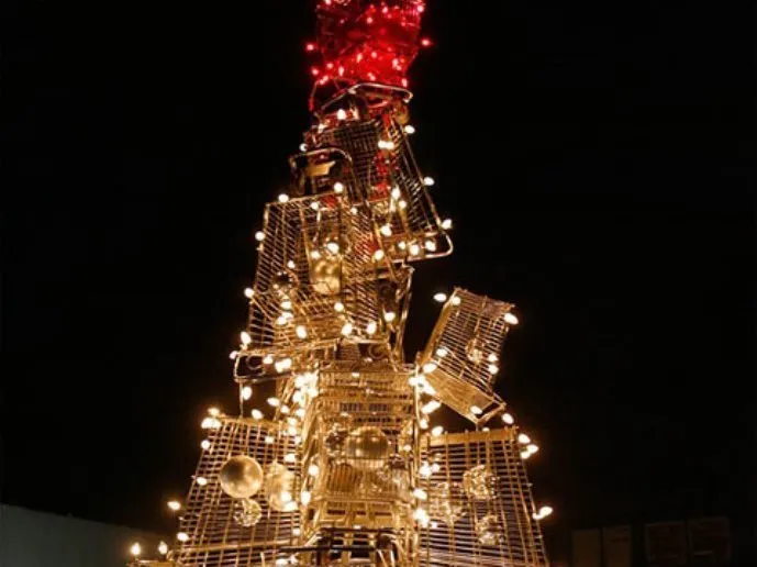 El artista Anthony Schmitt decoró un centro comercial en Santa Mónica con un árbol de 10 metros hecho de carritos de compras. Para construir esta estructura se necesitaron 86 cestas metálicas. Esta no es la primera 'árbol de cestas' de Anthony, el artista ha estado creándolos desde 2007.
