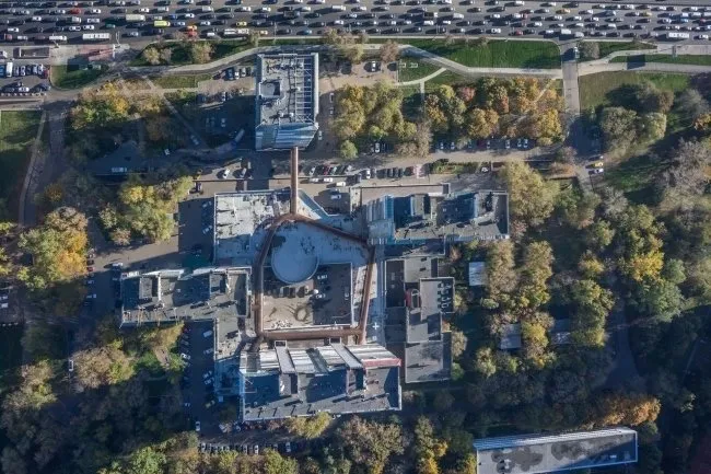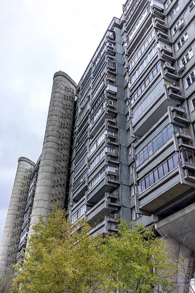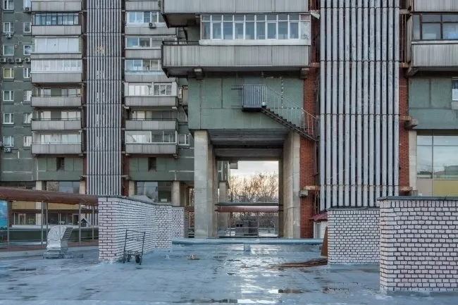 ¿En qué consiste la novedad: 20 pares de «patas» potentes se reducen hacia la base de forma que 2 personas pueden abrazar una columna con facilidad. Las columnas y la base del primer piso en forma de trapecio isósceles invertido están hechas de concreto armado monolítico, todos los demás pisos — de paneles de paredes. Visualmente el edificio se expande hacia arriba, aunque en realidad las losas simplemente están colocadas con un ángulo. Los planos de las escaleras ovaladas de los pasillos están perforados con filas verticales de ventanas-boys: ¿qué puede ser más brutal?