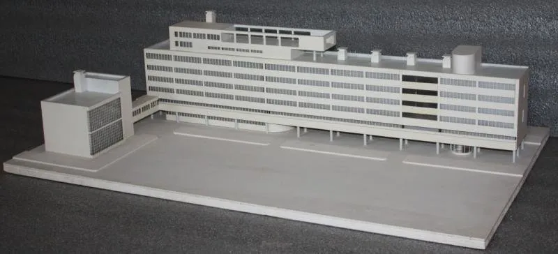 El largo cuerpo residencial de seis pisos se colocó paralelo a la avenida Novinskaya. Junto se construyó el edificio comunal: allí debían ubicarse la cocina, comedor, biblioteca, sala deportiva y zona del club. El cuerpo residencial estaba conectado con un corredor acristalado — la lluvia no podía impedir el descanso de los residentes. En el tercer edificio había solo dos pisos: aquí estaban el garaje y la lavandería mecánica.