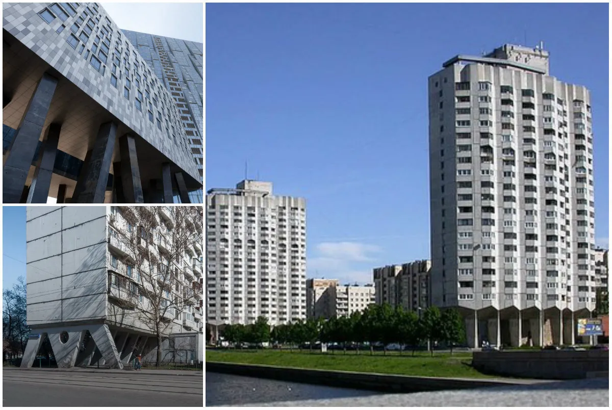 De izquierda a derecha: Edificio en Mosfilmovskaya, «Edificio con patas» en la ribera de Novosmolenskaya en San Petersburgo, «Edificio con patas» en VDNKh