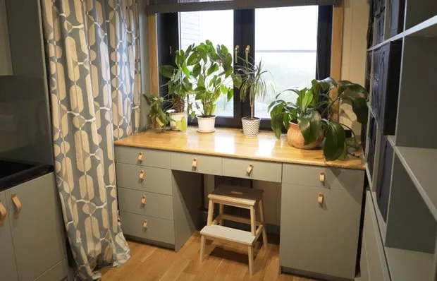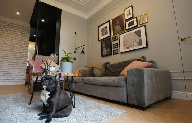En una pequeña vivienda de un solo cuarto cada centímetro se utilizó con eficiencia máxima: el diseñador Nina Ivanenko decoró una increíble vivienda para una joven y su bulldog francés. La cliente pidió prestar atención al lugar para secar la ropa — no había balcón en el apartamento y una secadora de suelo ocuparía demasiado espacio.