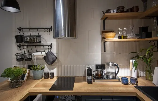 Un rincón de descanso acogedor junto al balcón aporta encanto especial a la vivienda. Gracias a los relojes estilo antiguo, estanterías europeas en lugar de cortinas y una magnífica vista a la zona de cocina con lámparas decorativas y platos aquí reina la serenidad y el calor.