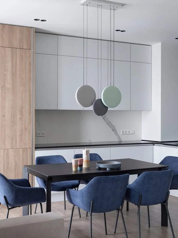 El diseñador ideó una decoración muy inusual para las aberturas. Primero, fueron hechas arqueadas y segundo, decoradas con madera natural. Esto se ve muy elegante y aumenta inmediatamente el status del interior. Otra interesante característica es la iluminación en el centro de las aberturas, para que estas zonas no queden a la sombra.