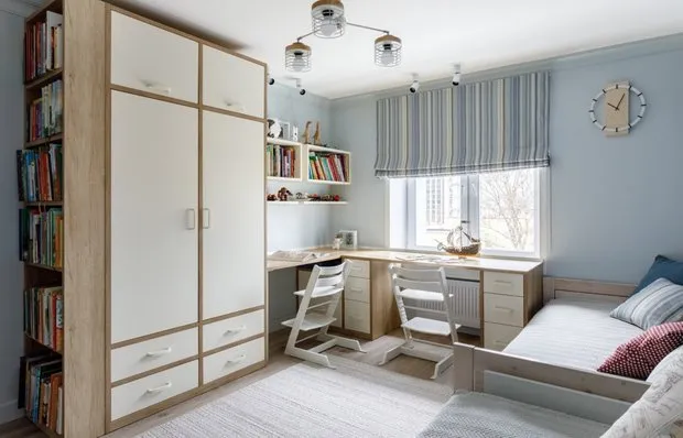 ¿No te gusta el blanco? Pinta la habitación con tu tono favorito y elige decoraciones y accesorios en ese color para crear una combinación armónica sin grandes dificultades. Por ejemplo, durante la reforma de la finca, la decoradora Jenya Zhdanova eligió un color diferente para cada habitación: una se volvió amarilla clara, otra — turquesa suave, la tercera — azul celeste, y la principal habitación — lavanda suave. Combinada con el suelo blanco y puertas blancas, la vagoneta se ve muy fresca y acogedora. Para facilitar la navegación, las puertas de las habitaciones fueron pintadas con los colores correspondientes según las ranuras de las esquinas, y en el vestíbulo ya puedes saber qué color tiene la habitación detrás de esa puerta.