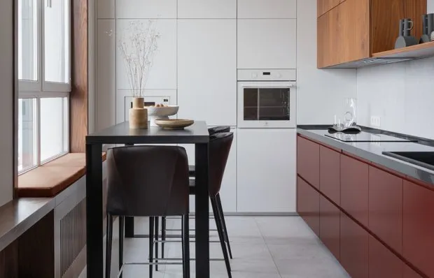Ilya y Alena Ereshchichev, una pareja matrimonial que crea la estúdio Sweet Home, utilizaron en la decoración de su finca ideas interesantes. La cocina es el corazón de la casa. El armario lo ideó Alena, quien también creó los planos, mientras que Ilya lo construyó con sus propias manos. La parte inferior del armario está revestida con azulejos de cerámica que se extienden al delantal, y los estantes superiores provienen de una marca barata de muebles.