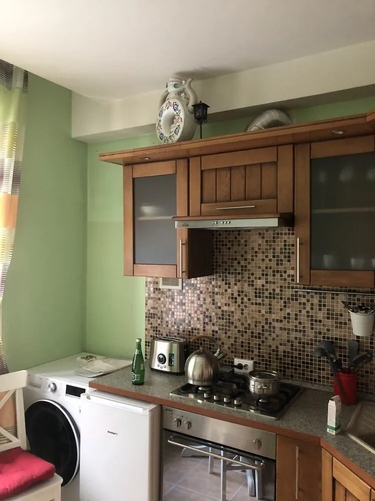 Tras la reconfiguración aumentamos el área del baño pequeño, instalando un lavamanos y previendo un sistema de almacenamiento. Nos deshicimos de la bañera y creamos una ducha funcional. La zona de sala se combinó con la cocina, para ello cortamos el gas. De una gran habitación diseñamos dos dormitorios que cumplen con las normas de vivienda (el área no debe ser inferior a 13.5 m²).